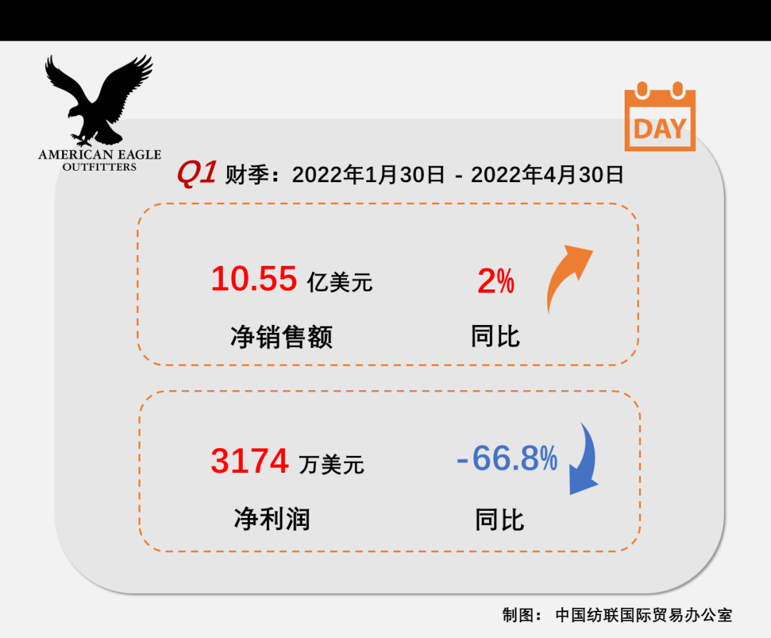 美国休闲服装品牌美鹰傲飞(American Eagle Outfitters)近日发布公司截至4月30日的2022财年第一季度业绩。财报显示,一季度该公司净销售额为10.55亿美元,同比增长2%;净利润为3174万美元,同比下滑66.8%。