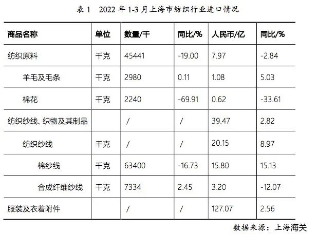 2022年1-3月,上海市纺织行业纺织品服装进口总额174.51亿元,其中服装及衣着附件进口总额127.07亿元,同比增长2.56%,占比约72.8%。纺织品进口中,纺织原料进口7.97亿元,同比下降2.84%,约占4.6%,纺织纱线、织物及制品进口额39.47亿元,同比增长2.82%。可见,上海市服装类产品进口比重巨大,服装和纱线织物进口保持平稳增长,但原料进口有所下降。值得注意的是,2022年1-3月纺织原料中的棉花进口数量大幅减少了近70%,进口额下降了近34%,羊毛及毛条量价略有些微增长。