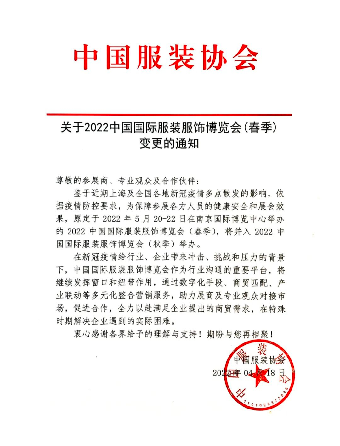 通知公告 | 关于2022中国国际服装服饰博览会(春季)变更的通知