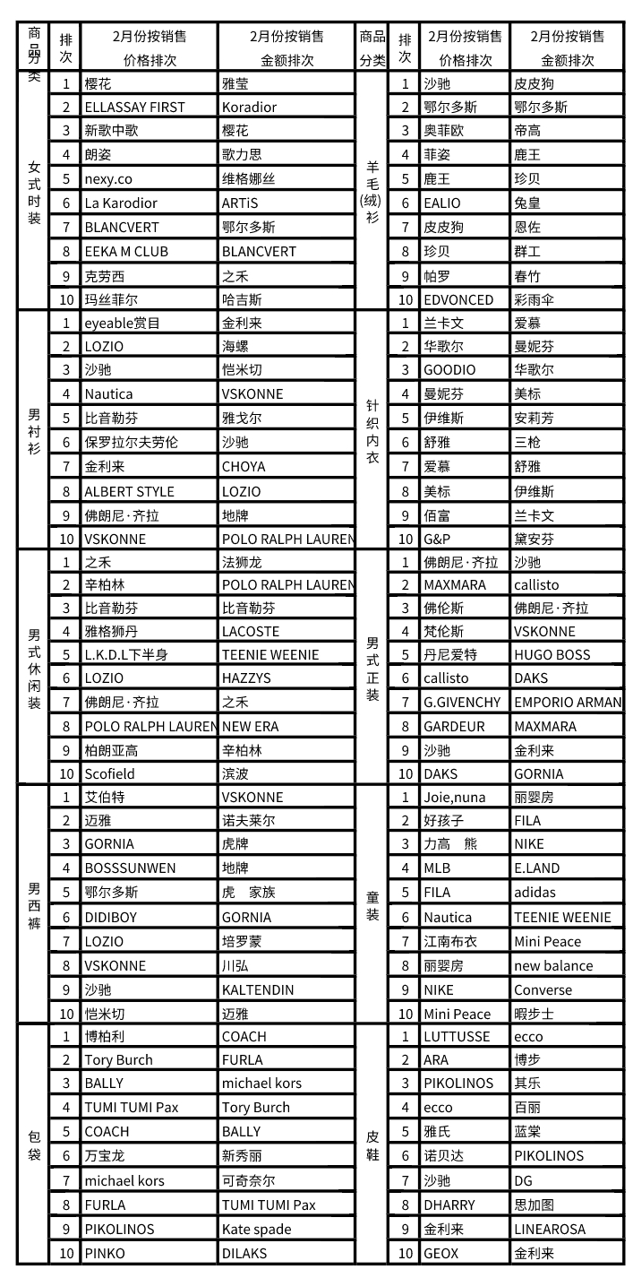 2022年2月上海服装行业协会网络信息服装商品销售品牌排行榜