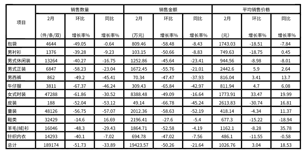 上海服装行业协会网络信息定期统计报表显示,2022年2月份,上海十大商场服装大类商品总体共销售18.92万件,环比上月减少了20.27万件,环比减少了51.73%,销售数量同比减少9.70万件,同比减少33.89%。2022年2月份,上海十大商场服装大类商品共计销售1.94亿元,环比上月减少1.96亿元左右,环比减少50.26%,销售金额同比减少0.54亿元,同比减少21.64%。本月平均销售价格为1026.76元/件,环比上升3.04%,同比上升18.53%。从2022年2月份上海服装行业协会网络商场销售情况看,受到国内疫情多点暴发和岁末年初促销后续效应及年初传统销售淡季影响,环比上月和同比上年,实体服装类商品销售数量和收入均明显减少。