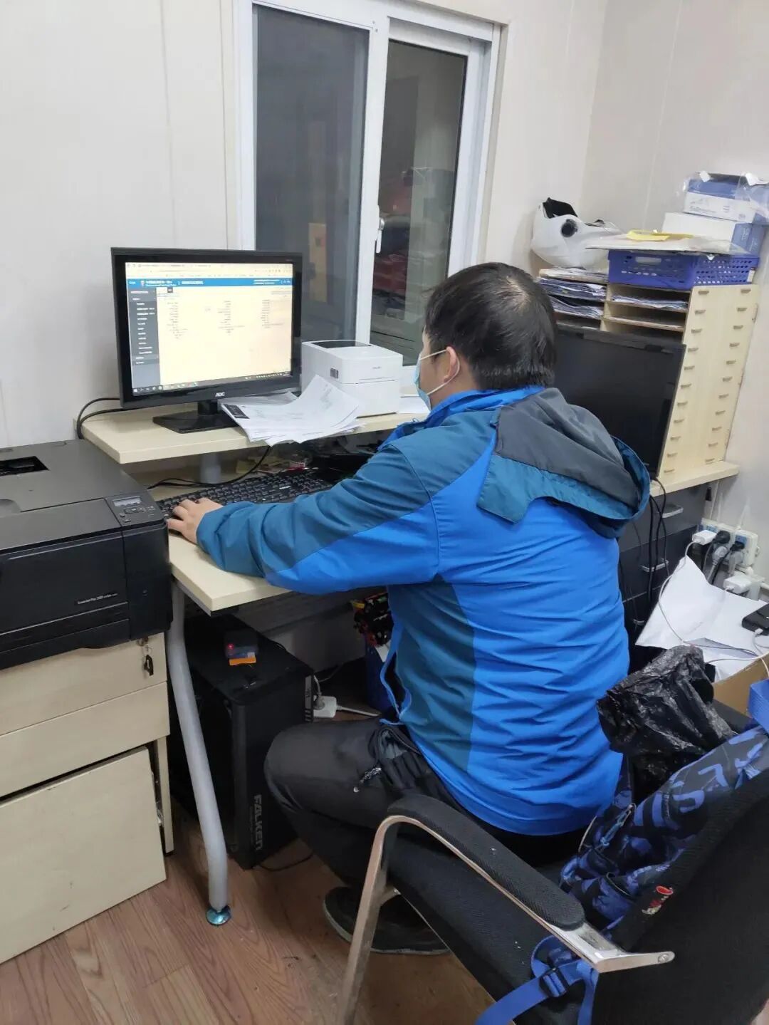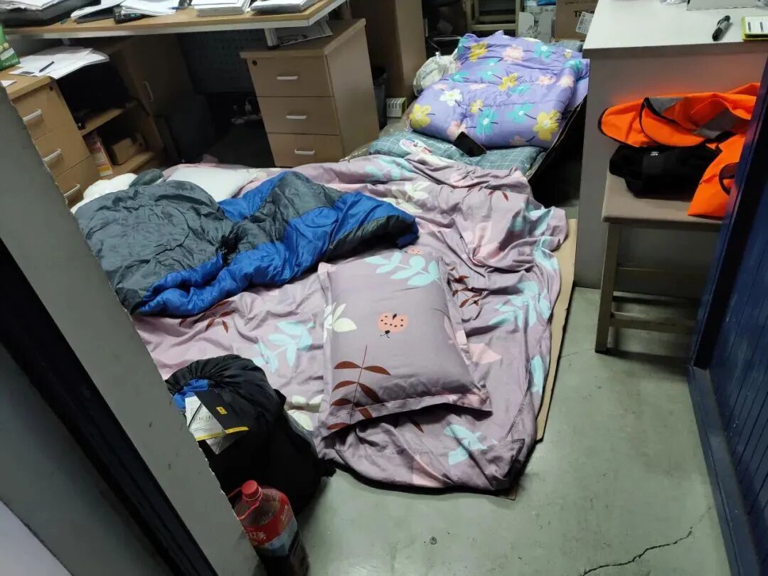 晚上九点,提交园区入园封闭人员名单。晚上九点半,新联纺物流的员工陆续抵达办公室。晚上十点半之后,经多方调集的生活物资送达。凌晨十二点,园区封闭。没有地方睡?就在狭小的办公区打地铺。生活物资不够?公司同事争分夺秒到处购买后送到园区。人手不够?一个顶俩,加班加点,保证物流供应不断不乱。
