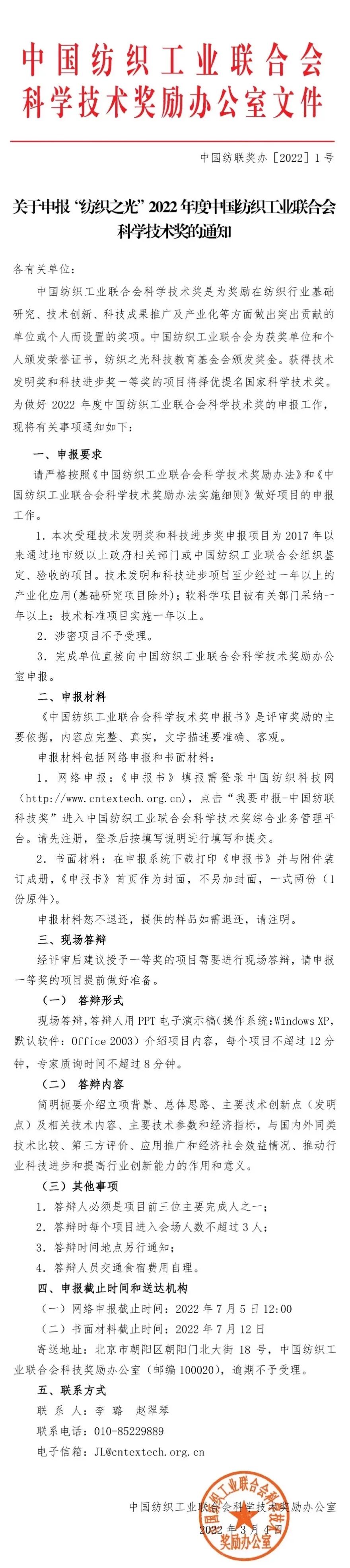 中国纺织工业联合会科学技术奖是为奖励在纺织行业基础研究、技术创新、科技成果推广及产业化等方面做出突出贡献的单位或个人而设置的奖项。中国纺织工业联合会为获奖单位和个人颁发荣誉证书,纺织之光科技教育基金会颁发奖金。获得技术发明奖和科技进步奖一等奖的项目将择优提名国家科学技术奖。为做好 2022 年度中国纺织工业联合会科学技术奖的申报工作,现将有关事项通知如下: