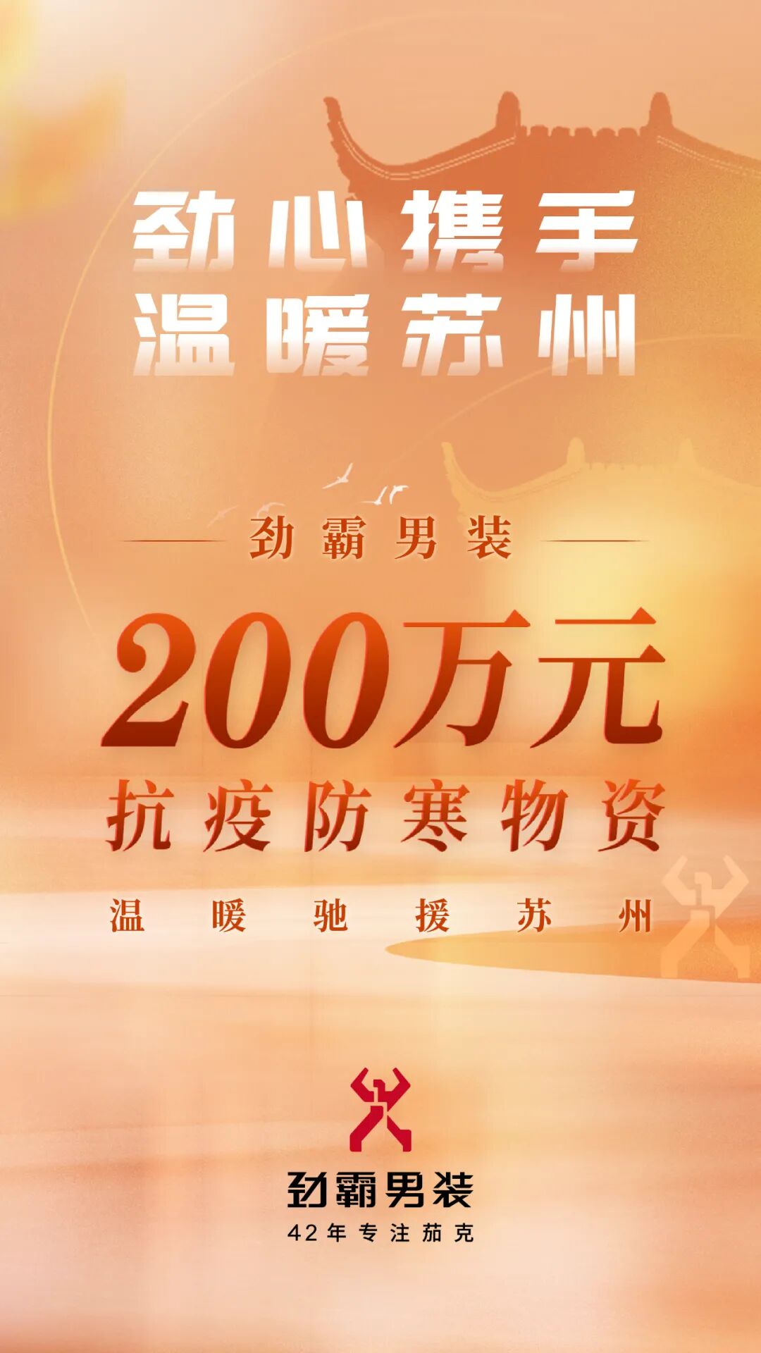 此次驰援苏州,再一次践行了劲霸男装的家国情怀和责任担当。自2020年疫情爆发以来,劲霸怀抱公益之心与家国大爱,劲心携手抗疫防疫,已捐赠物资37次,累计捐助人民币510万元、价值6050万元衣服、口罩近千万个。