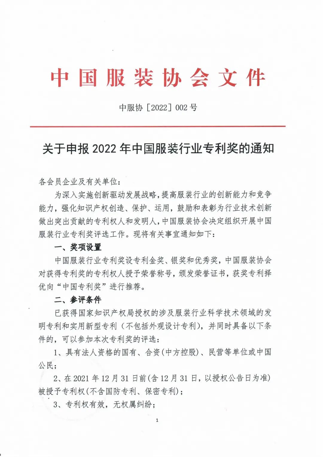 为深入实施创新驱动发展战略,提高服装行业的创新能力和竞争能力,强化知识产权创造、保护、运用,鼓励和表彰为行业技术创新做出突出贡献的专利权人和发明人,中国服装协会决定组织开展中国服装行业专利奖评选工作。现将有关事宜通知如下: