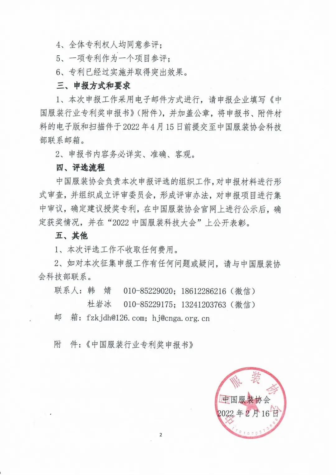 1、本次申报工作采用电子邮件方式进行,请申报企业填写《中国服装行业专利奖申报书》(附件),并加盖公章,将申报书、附件材料的电子版和扫描件于2022年4月15日前提交至中国服装协会科技部联系邮箱。