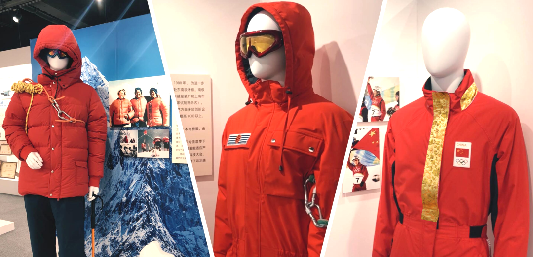 ▲左图1975年珠峰登山服,中图1988南极科考服,右图2006都灵冬奥韩晓鹏比赛服