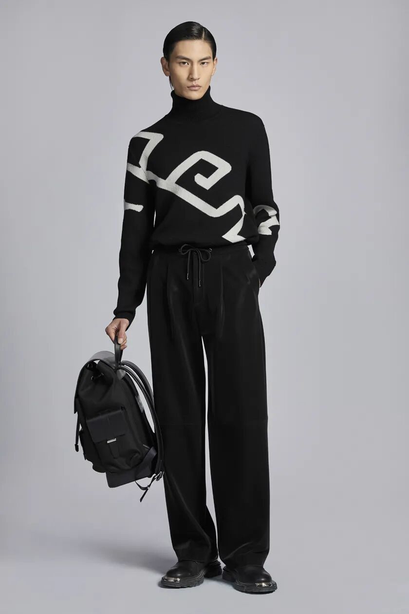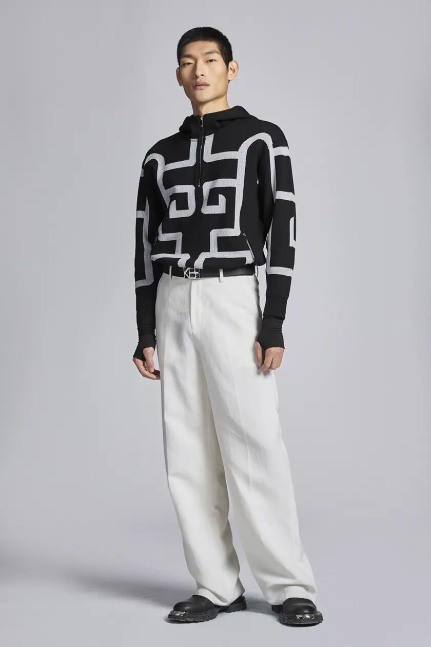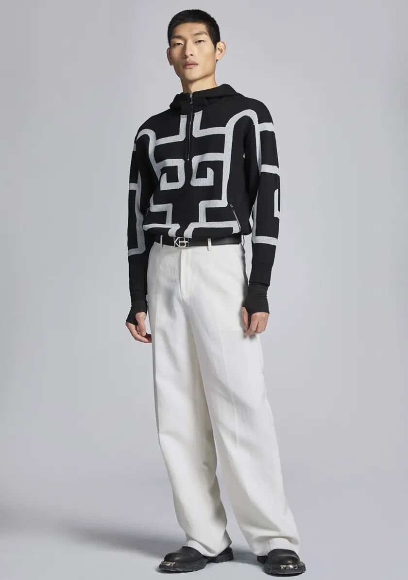 大廓形的高级羊绒连帽毛衣,黑白对比色的大幅提花工艺展现更具未来感风格的玉龙纹。