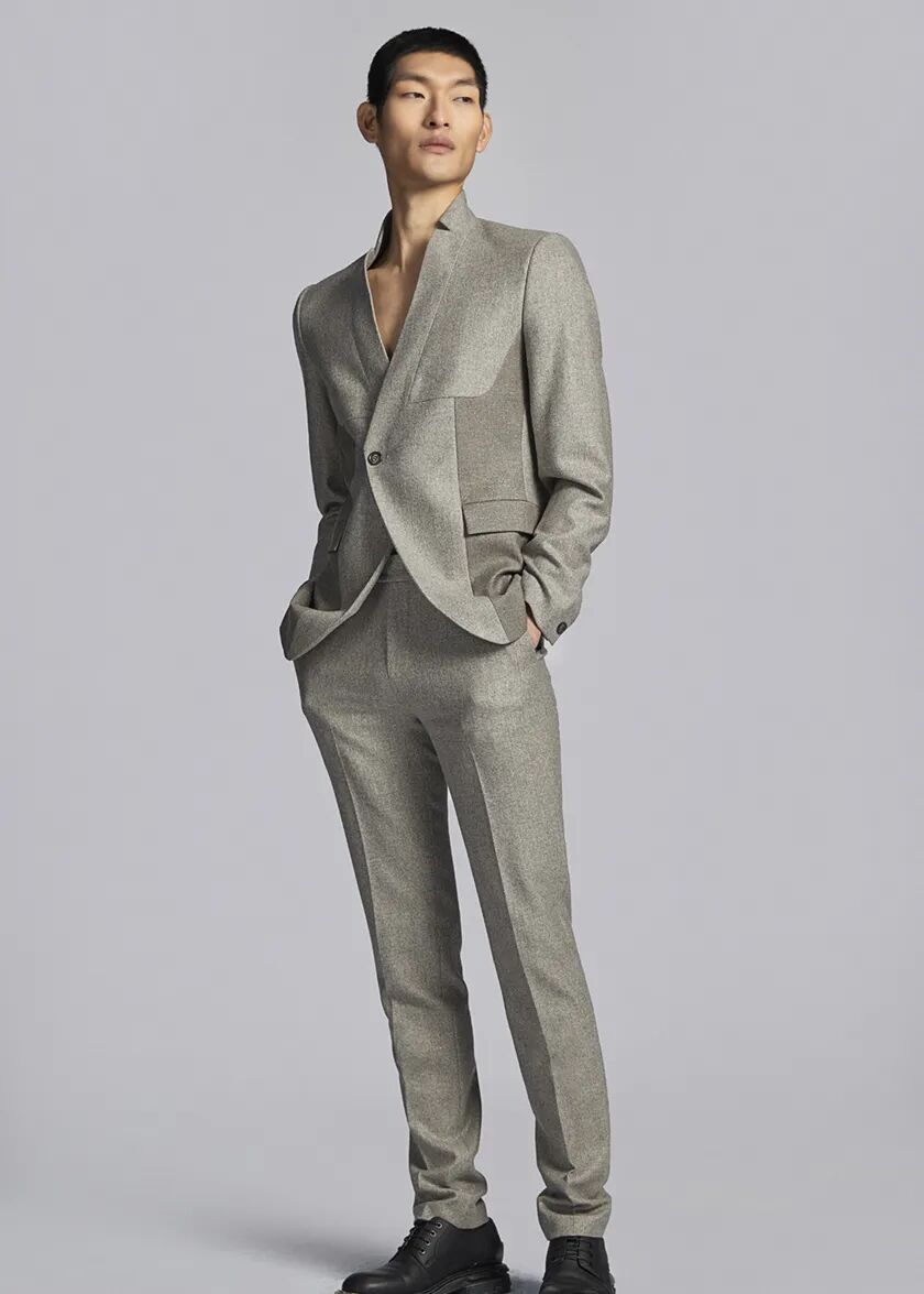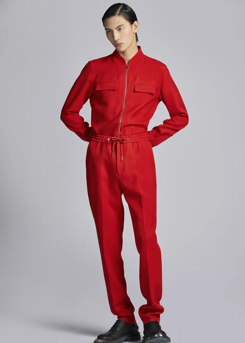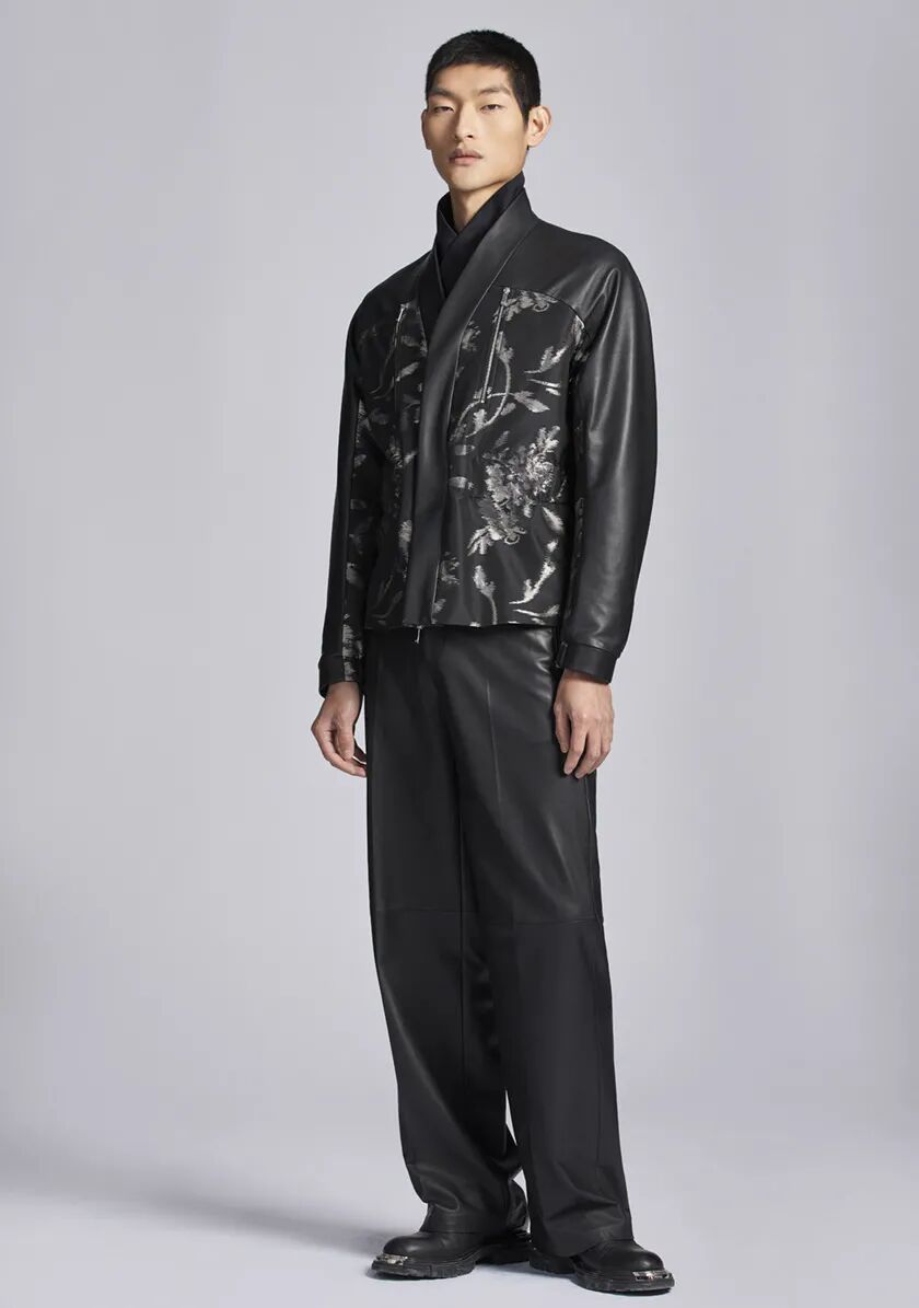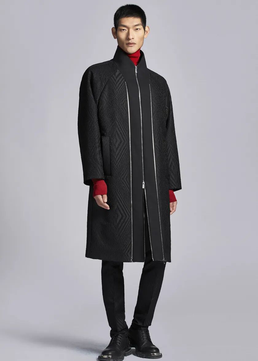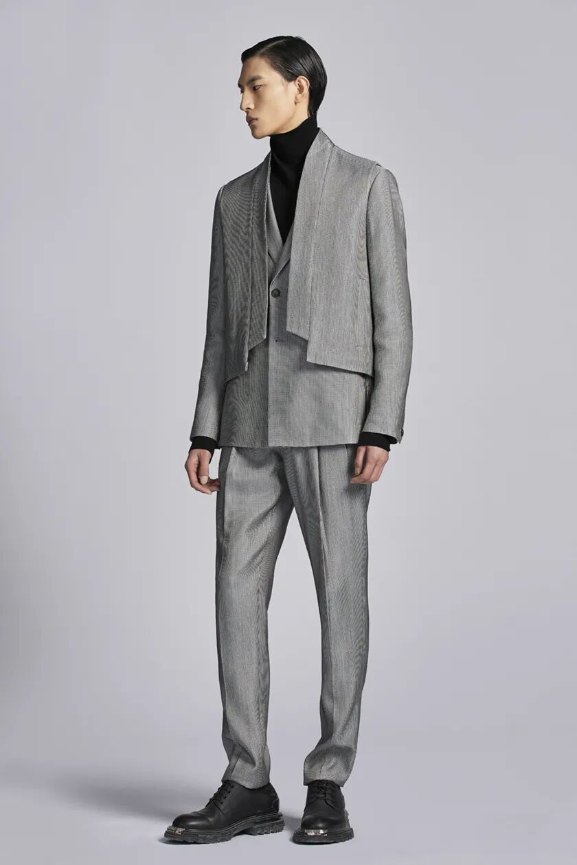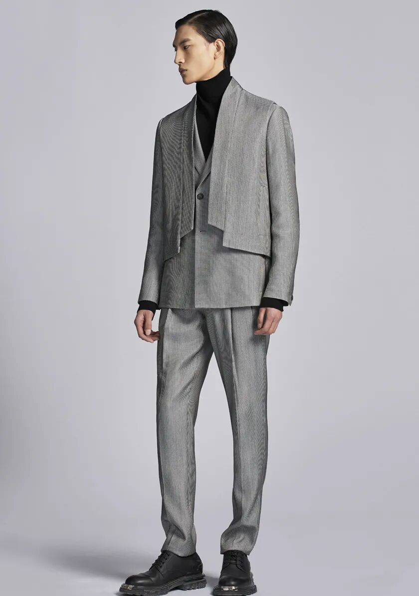 戗驳领高级剪裁西装。别致排扣的单西,保留常规廓形,用拉链设计取代经典的胸袋。别致的双前褶设计,叠加在单西之上的背心,现代化重新诠释汉服概念,将西方和东方概念相结合,和谐共存,优雅尽显。