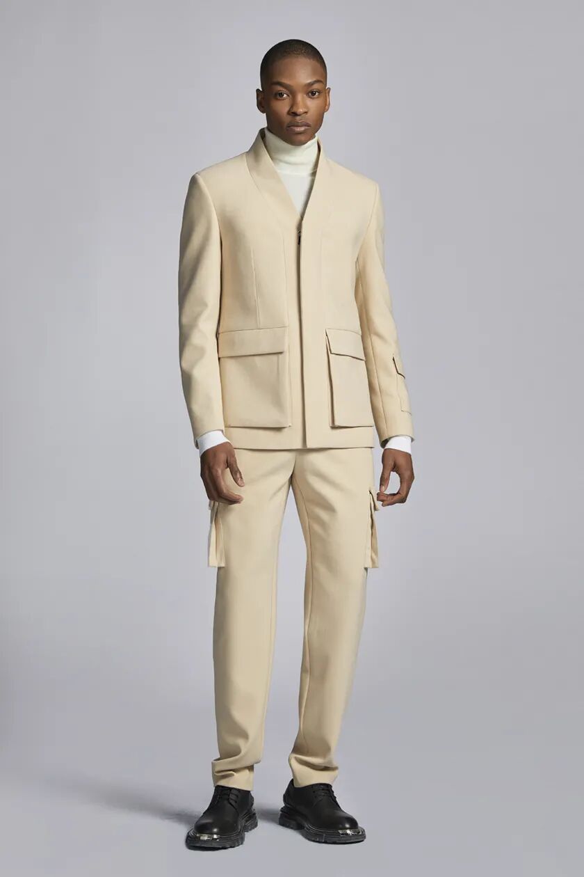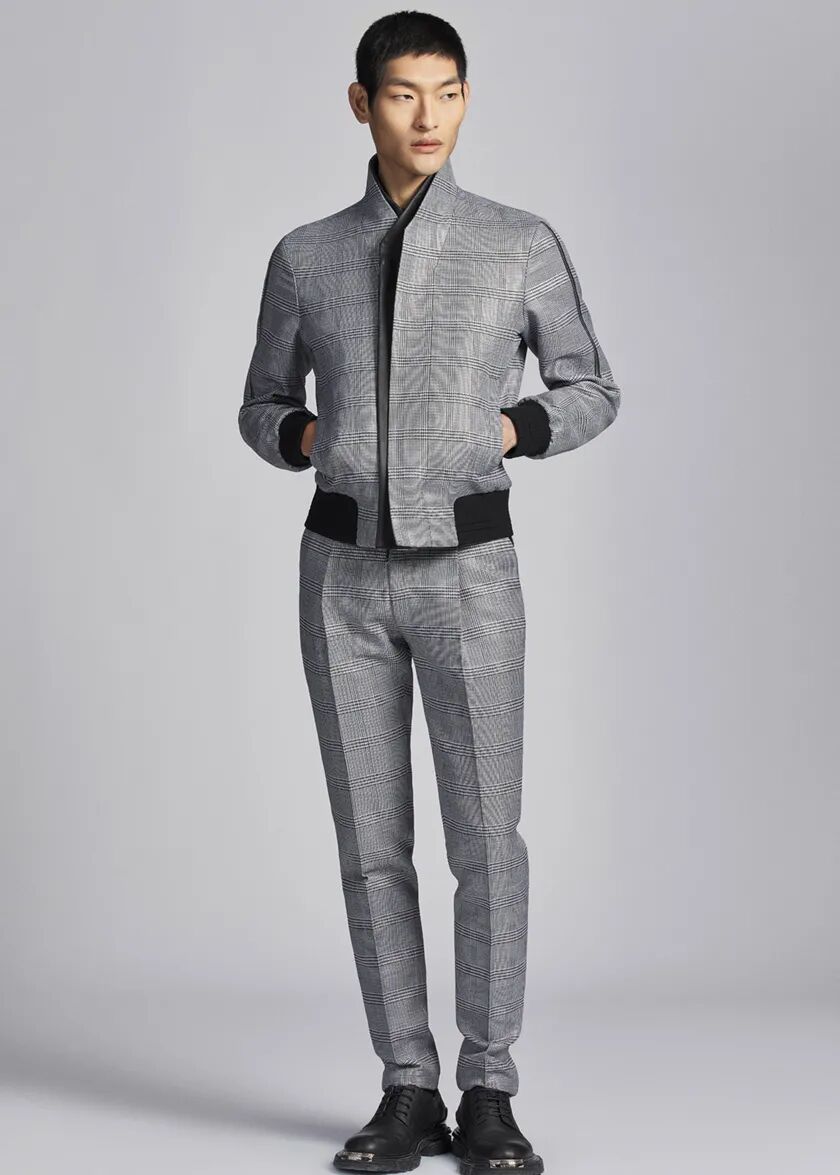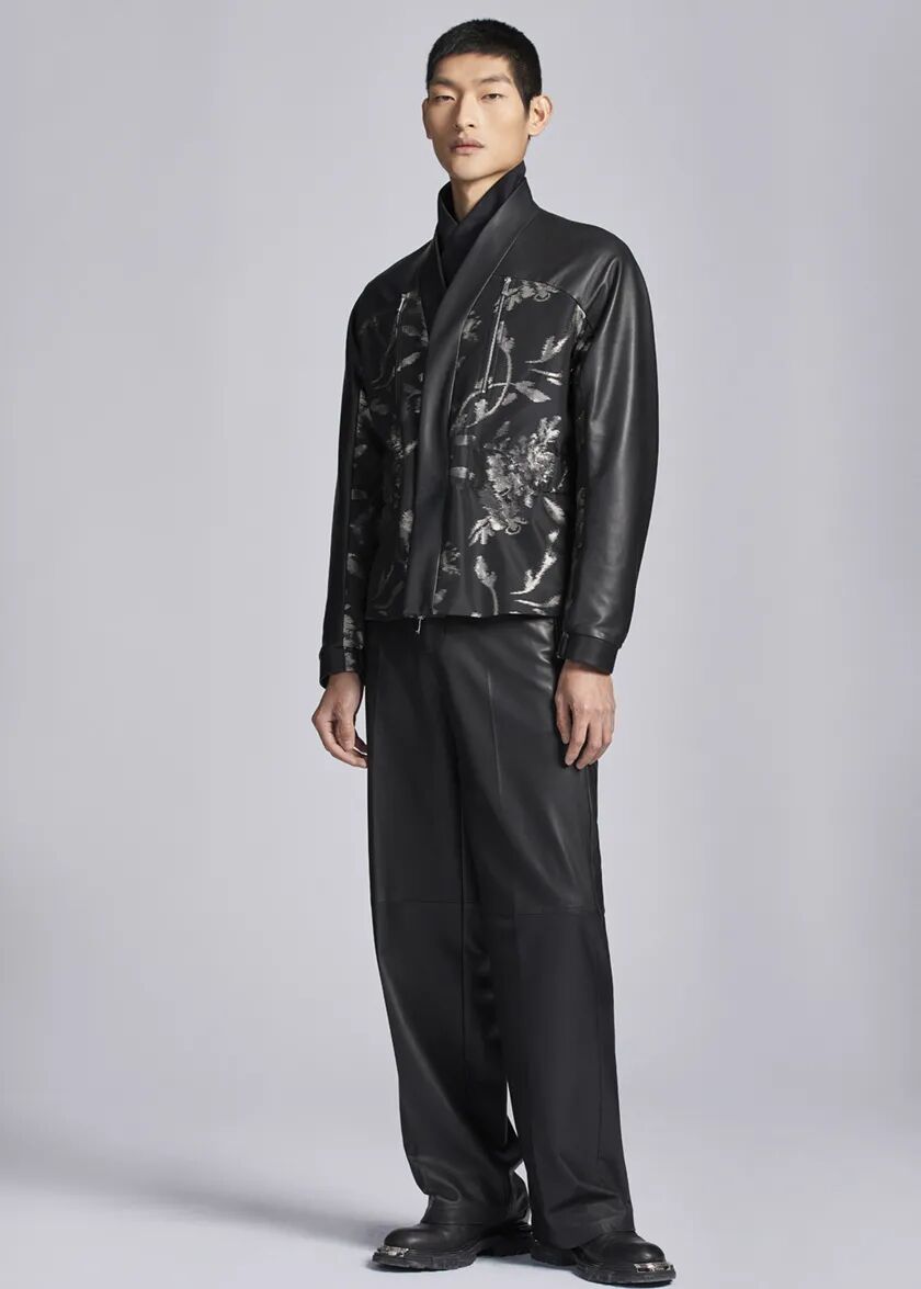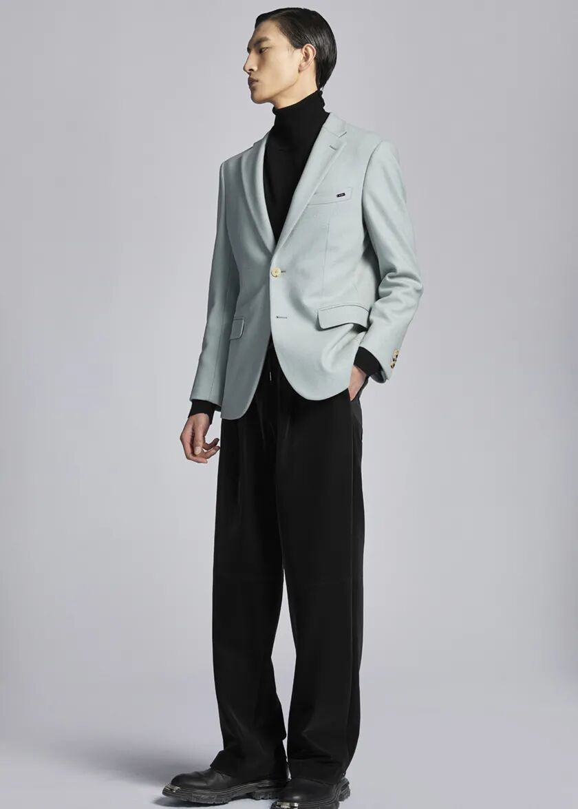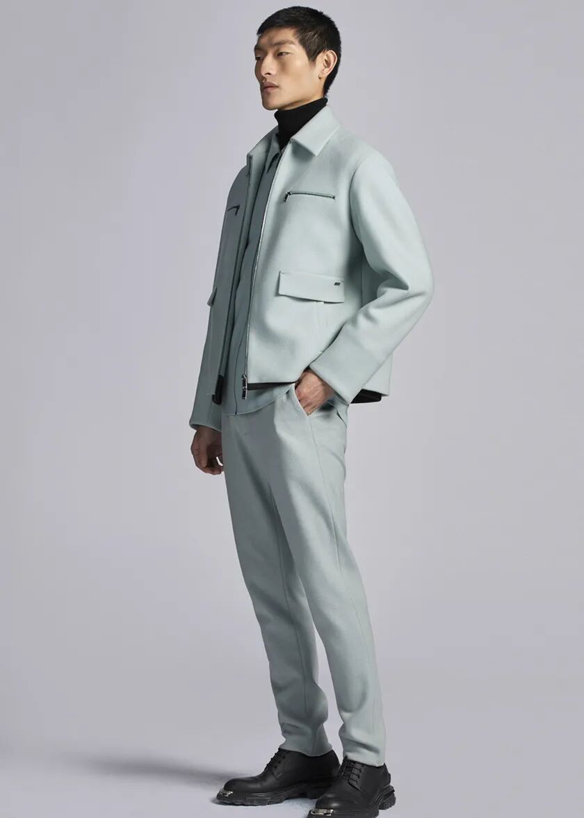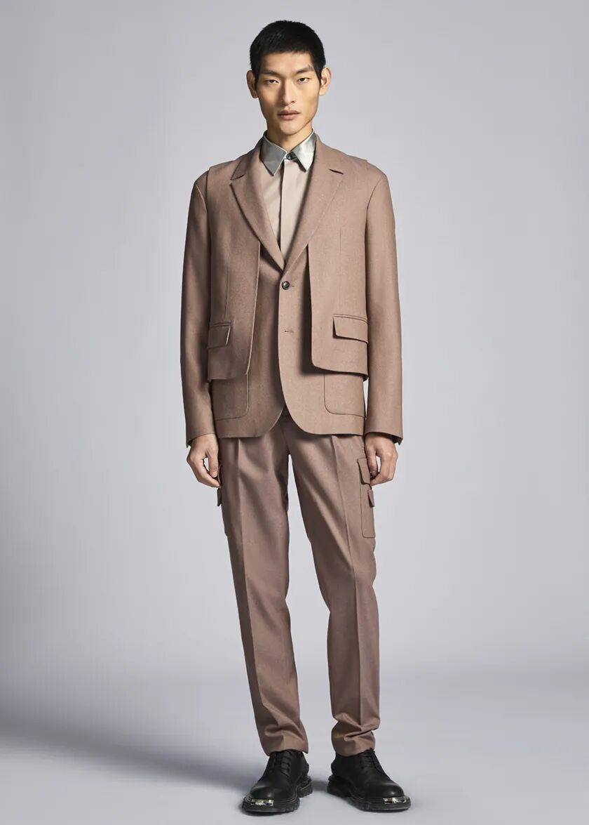 戗驳领高级剪裁西装。别致排扣的单西,保留常规廓形,用拉链设计取代经典的胸袋。别致的双前褶设计,叠加在单西之上的背心,现代化重新诠释汉服概念,将西方和东方概念相结合,和谐共存,优雅尽显。