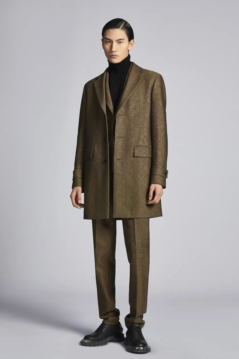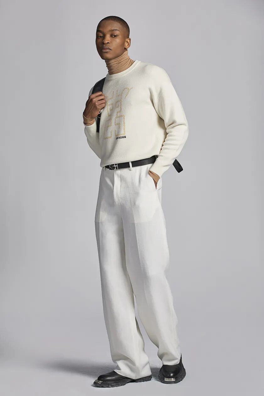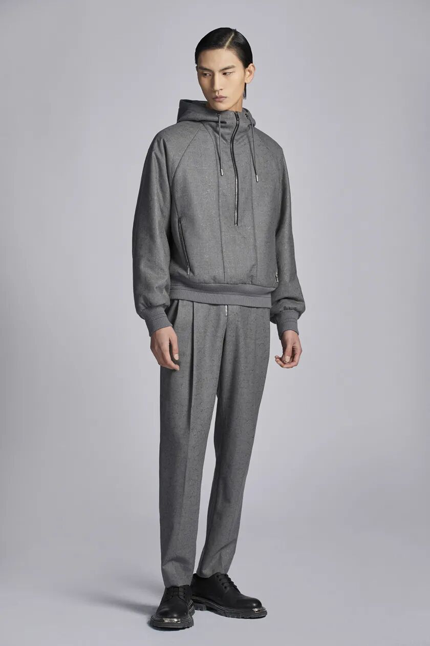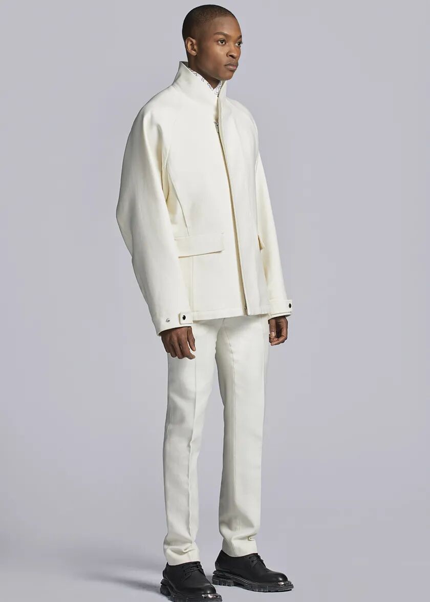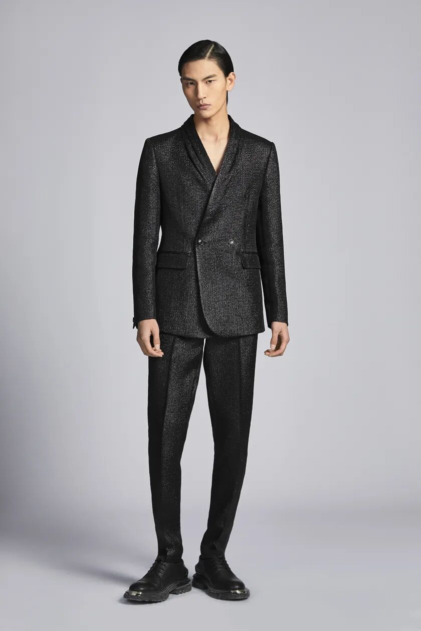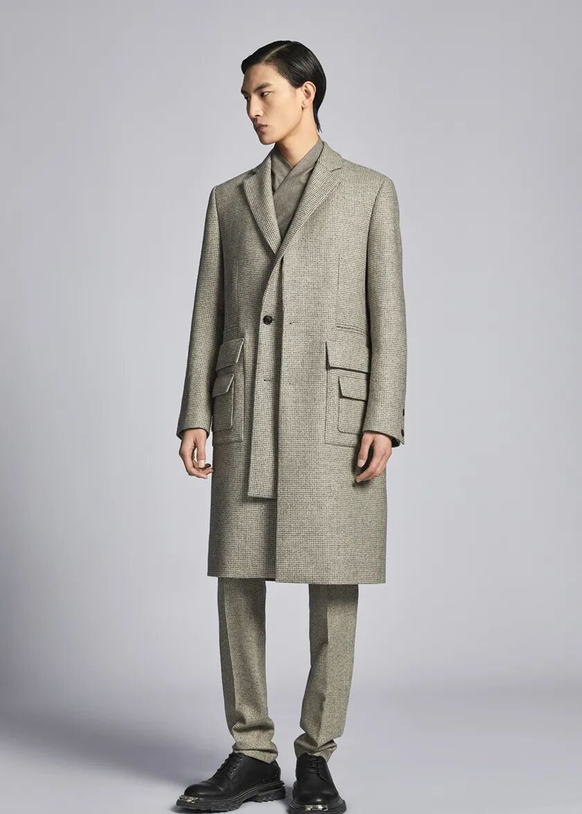 戗驳领高级剪裁西装。别致排扣的单西,保留常规廓形,用拉链设计取代经典的胸袋。别致的双前褶设计,叠加在单西之上的背心,现代化重新诠释汉服概念,将西方和东方概念相结合,和谐共存,优雅尽显。