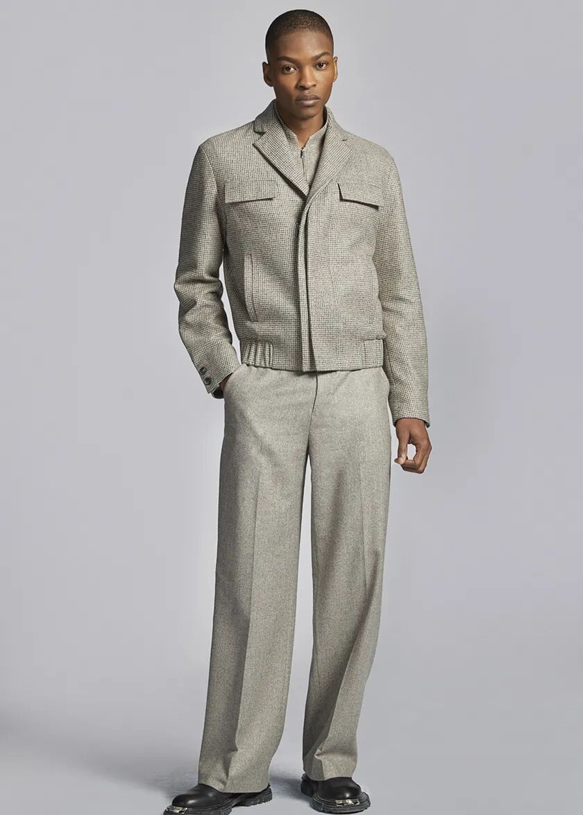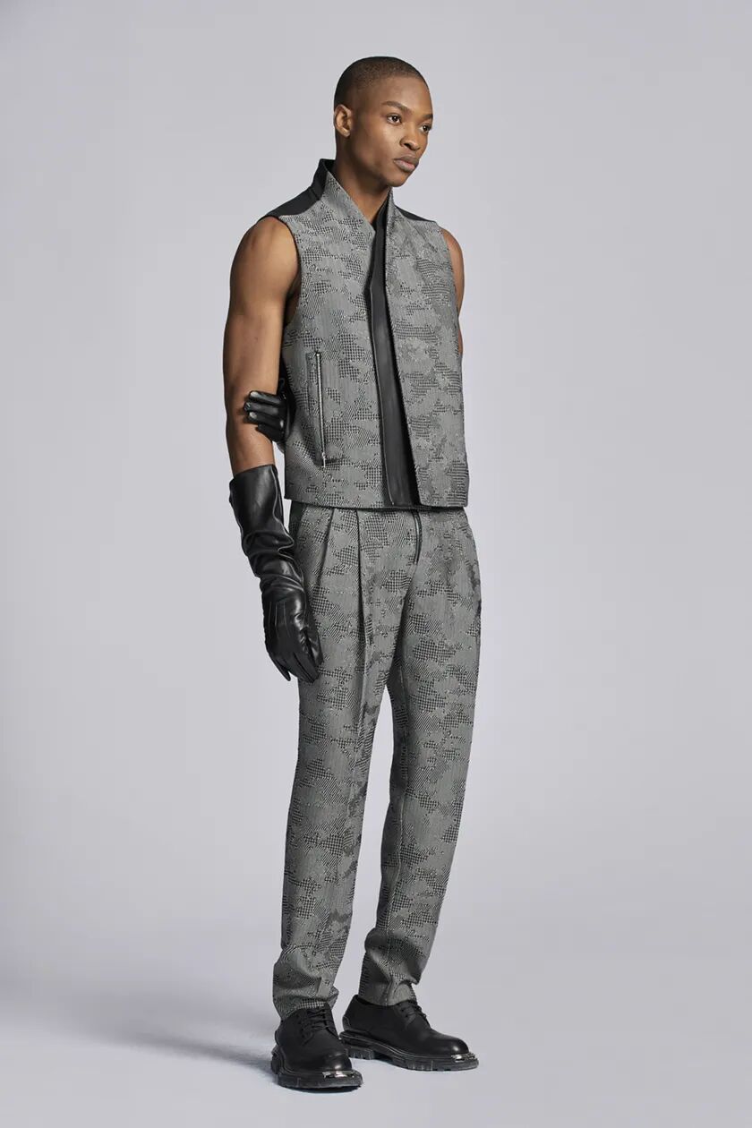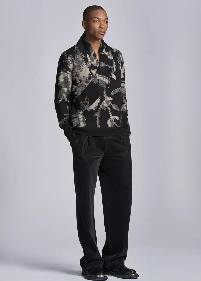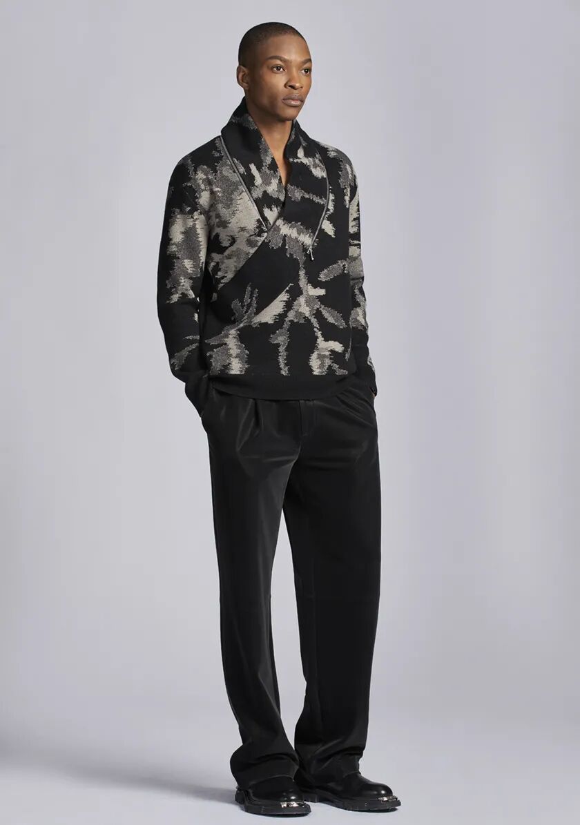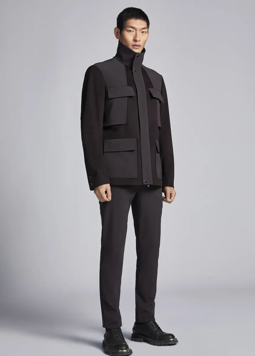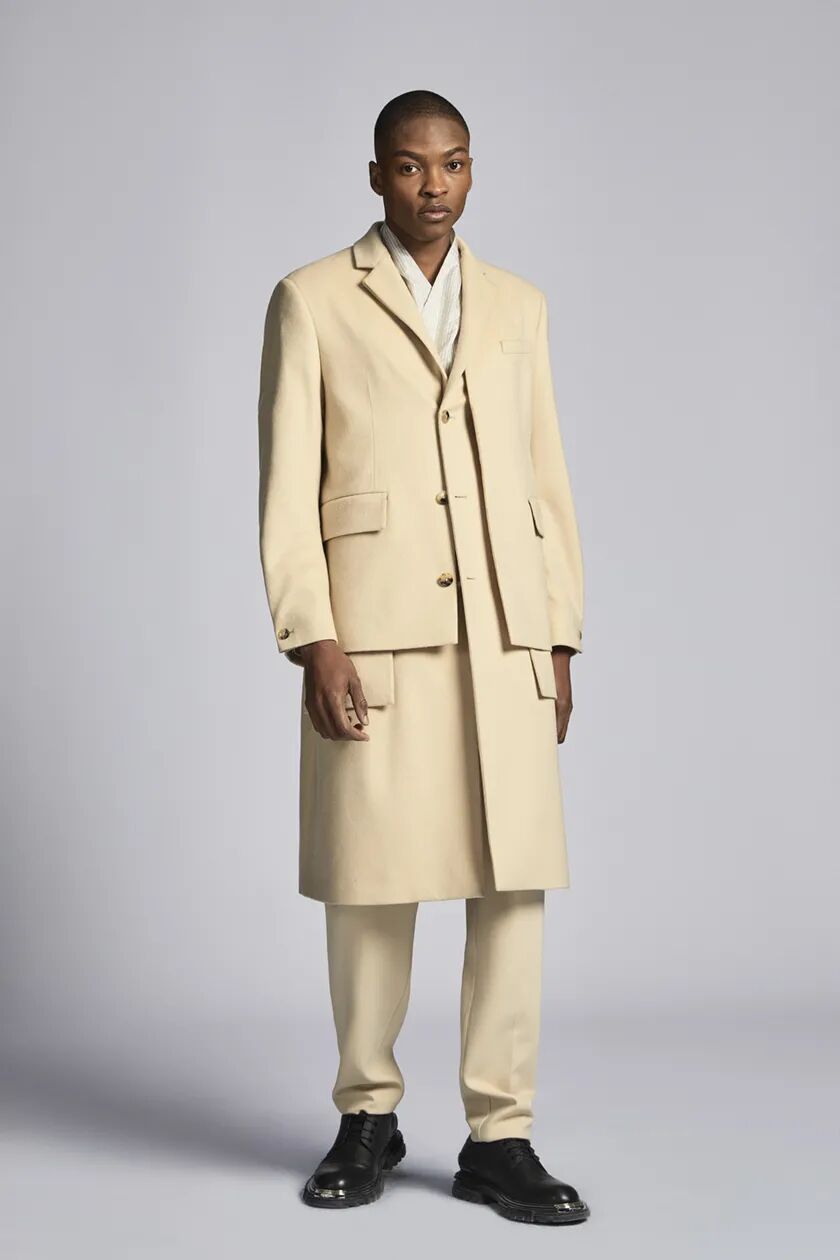 戗驳领高级剪裁西装。别致排扣的单西,保留常规廓形,用拉链设计取代经典的胸袋。别致的双前褶设计,叠加在单西之上的背心,现代化重新诠释汉服概念,将西方和东方概念相结合,和谐共存,优雅尽显。