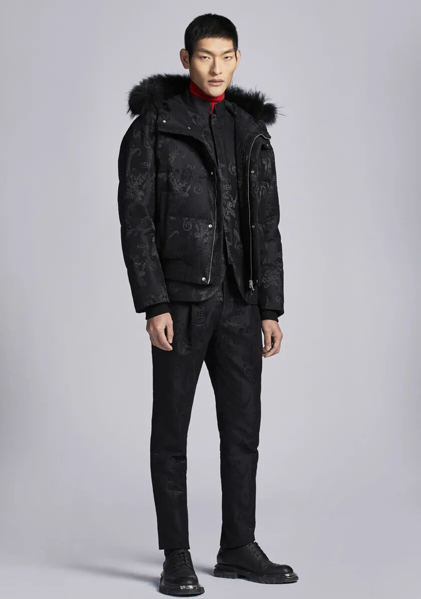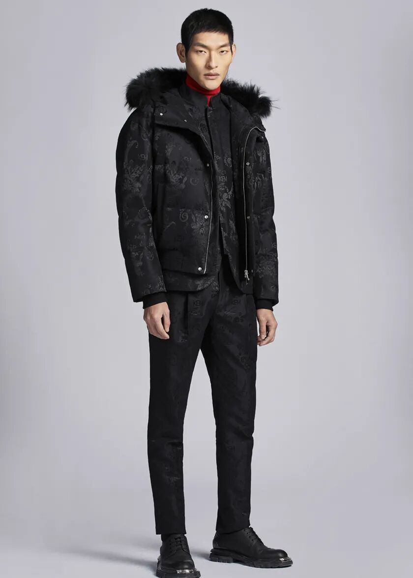 现代羽绒服款式,内搭单西中式领,搭配KB HONG独有东方风格花型及专属面料,古典之处尽显高级。