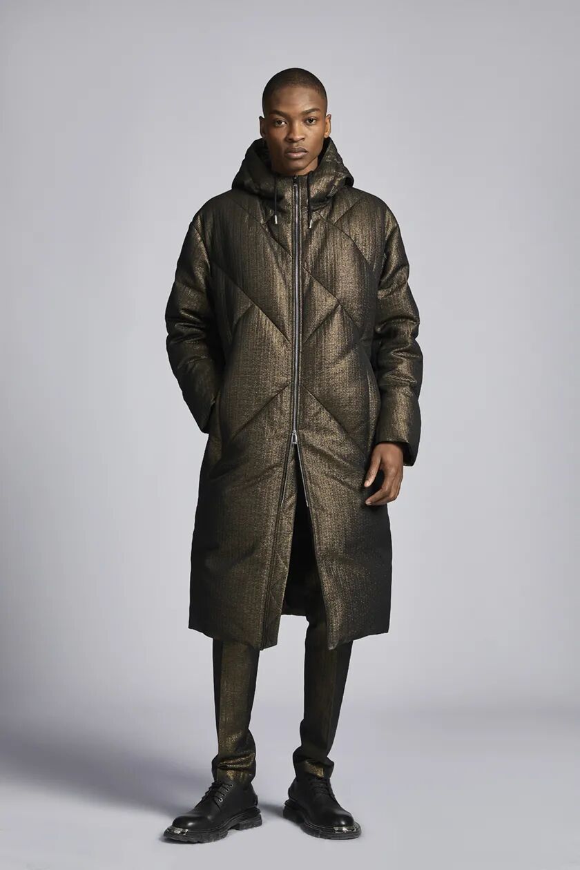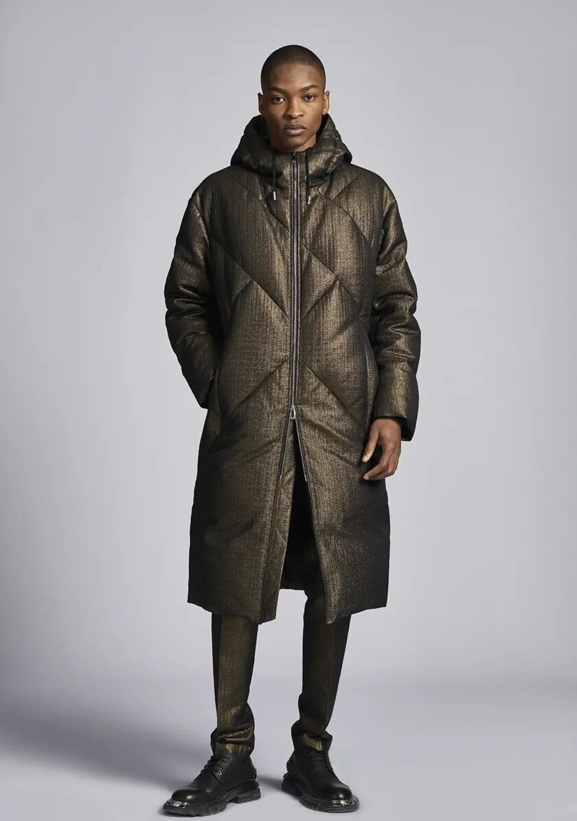 奢华感压轴:高端质感与格调永续。从浅金色向黑金过渡,金色松针图案,白绒金丝松针面料以及黑银羽绒服切割感,逐渐递进,黑金搭配作为压轴出场,带来流光溢彩的大面积视觉冲击。