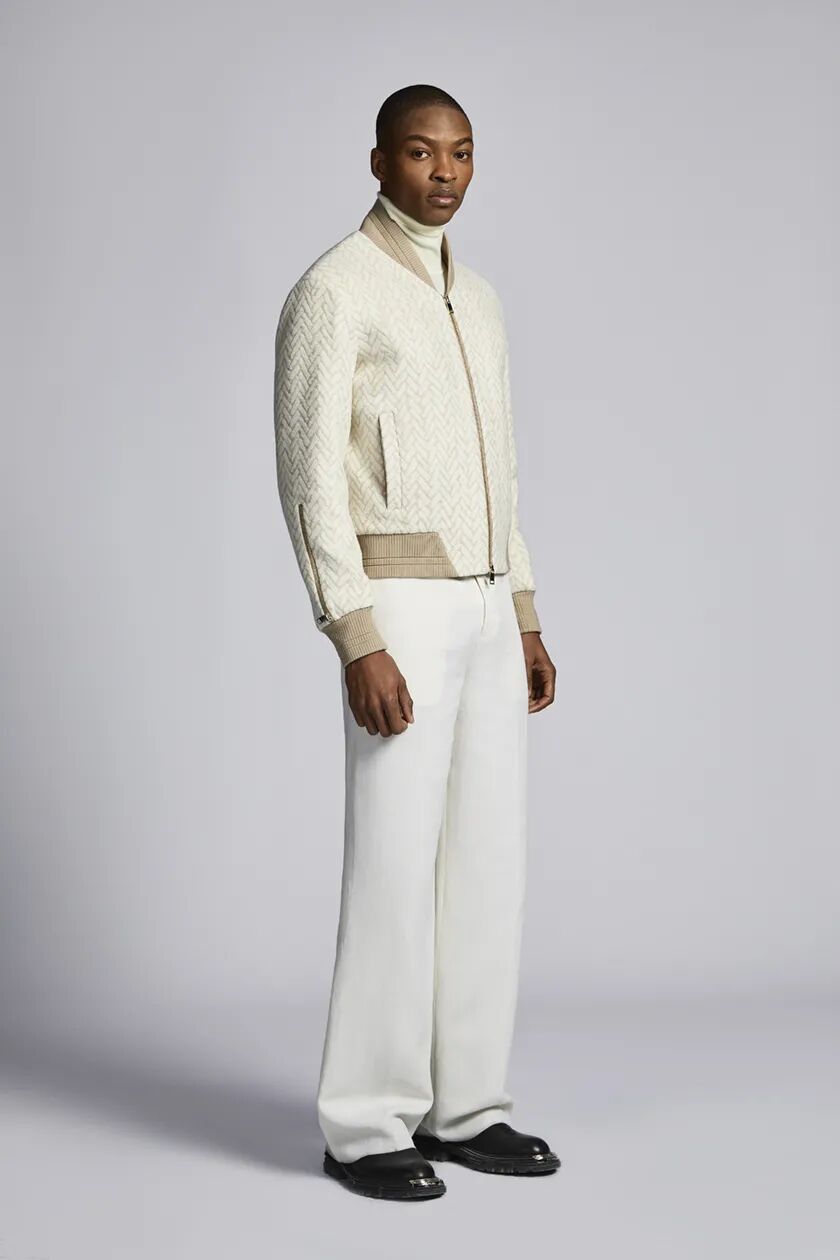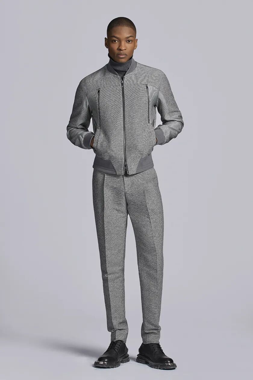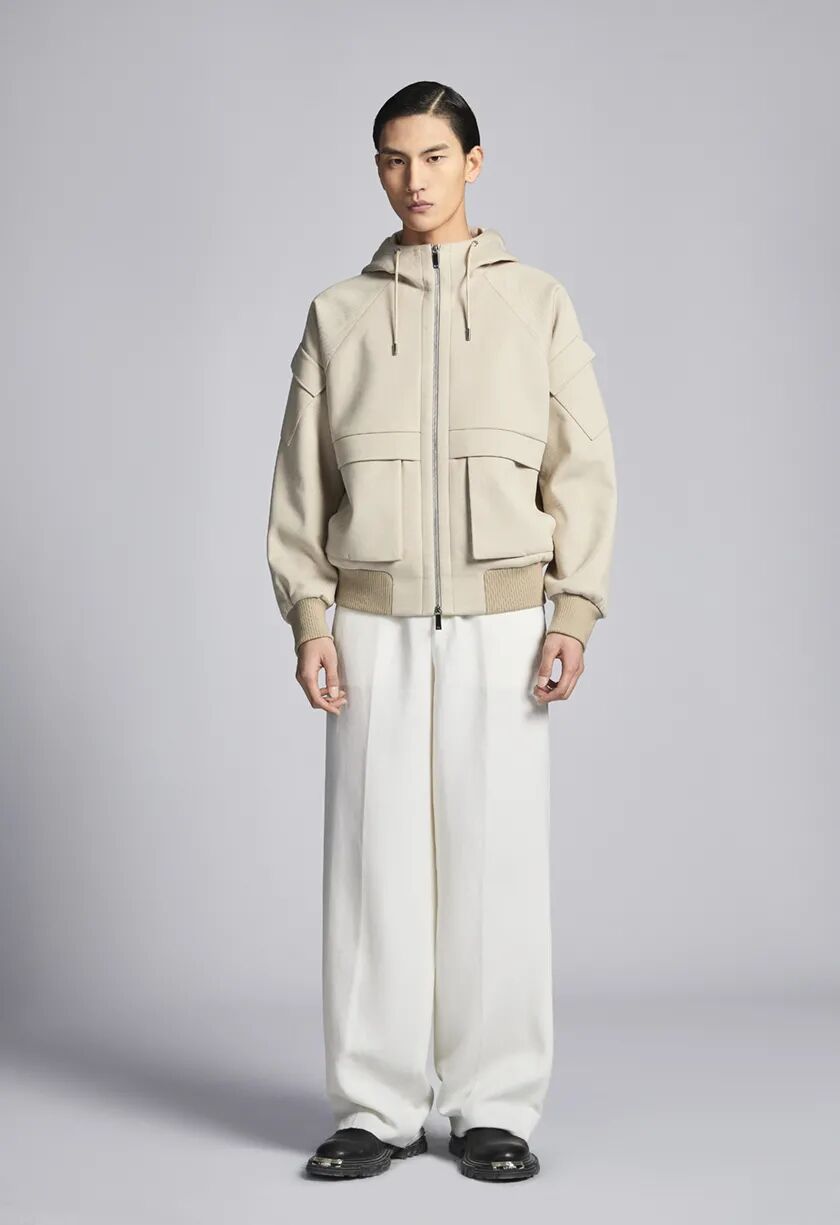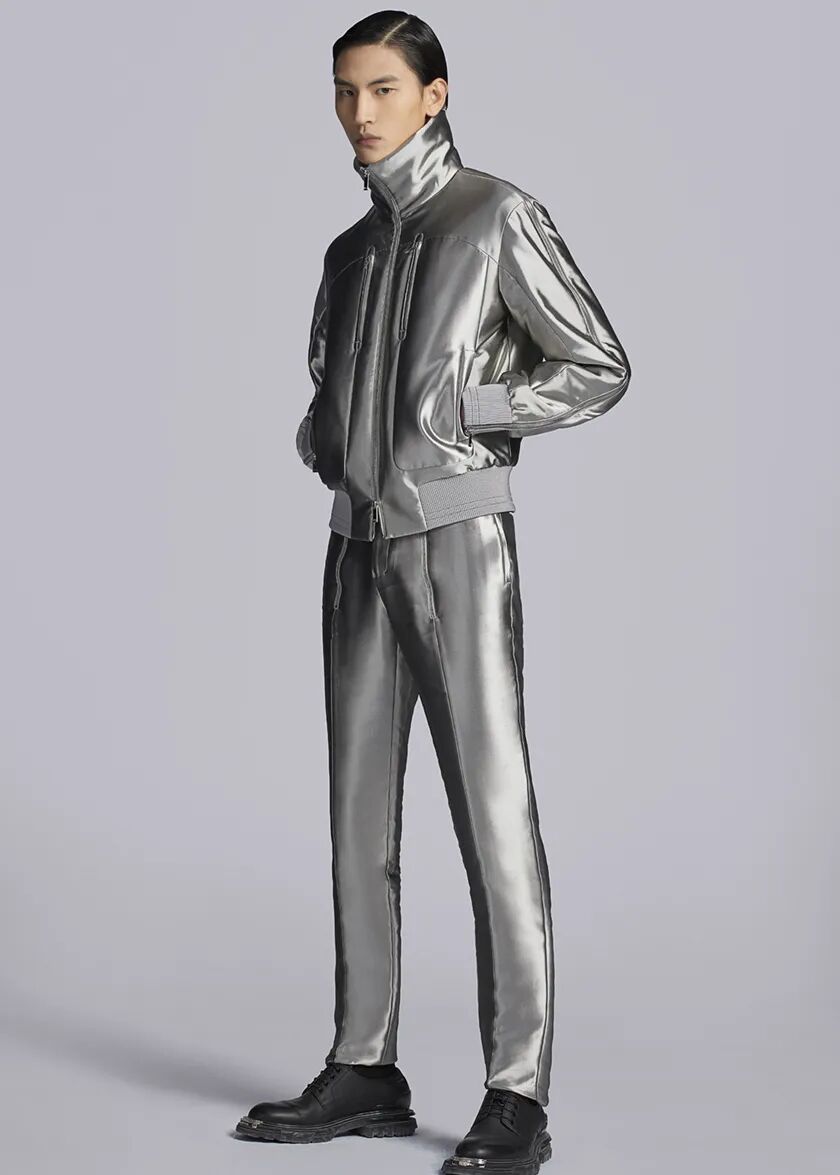 未来派风格宽松廓形茄克,灵感来源于宇航员穿着的宇航服结构,并通过不寻常的剪裁展现。对称的拉链及纹理设计暗合中国和谐之道,进口双材质面料拼接手法,让服装更加有层次感。真丝羊毛混纺的材质,通过两种相似但不相同的浅灰色肌理让整套造型更加熠熠生辉。