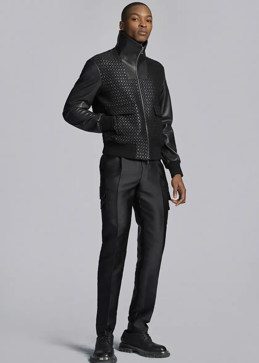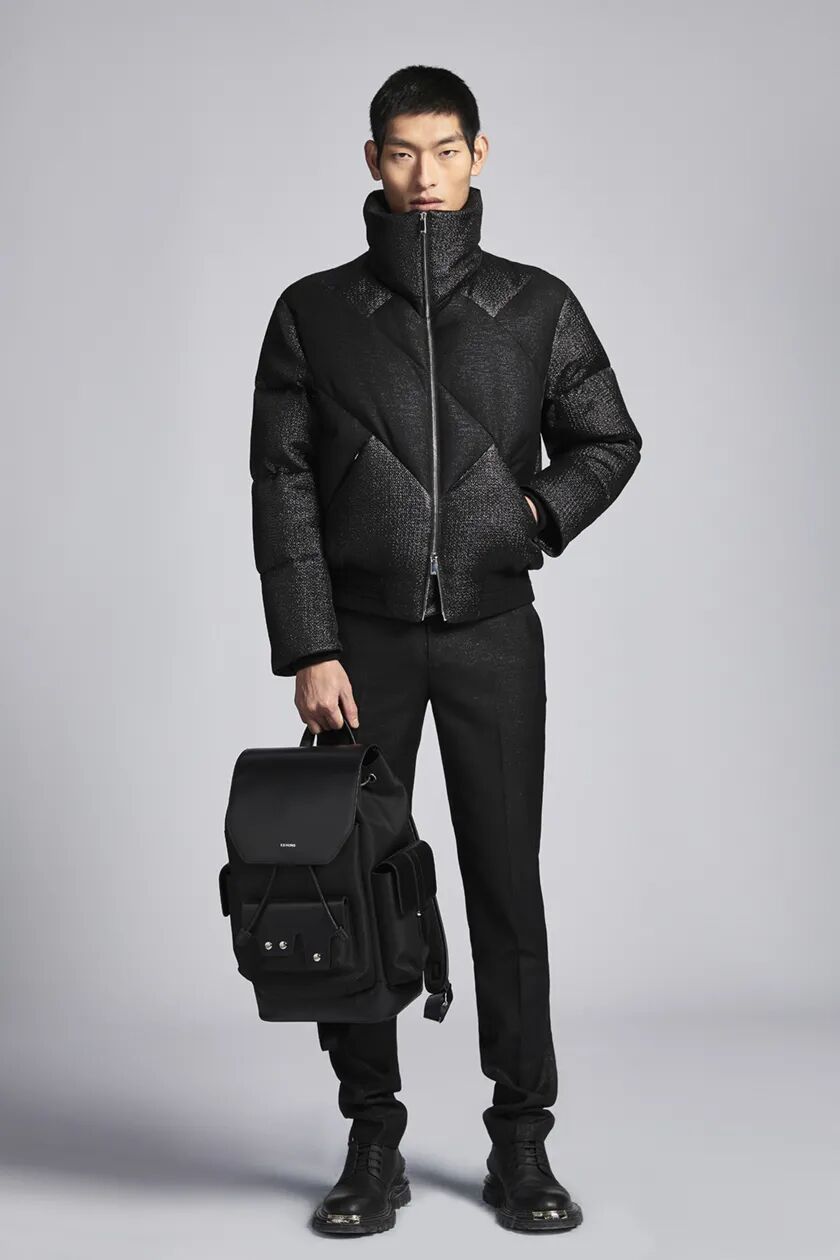 运用几何剪裁的廓形黑色短款羽绒服,进口羊毛涤纶双材质面料让黑色服装更具立体感。菱形绗缝、双头拉链设计细节,塑造雅致有型的着装典范。