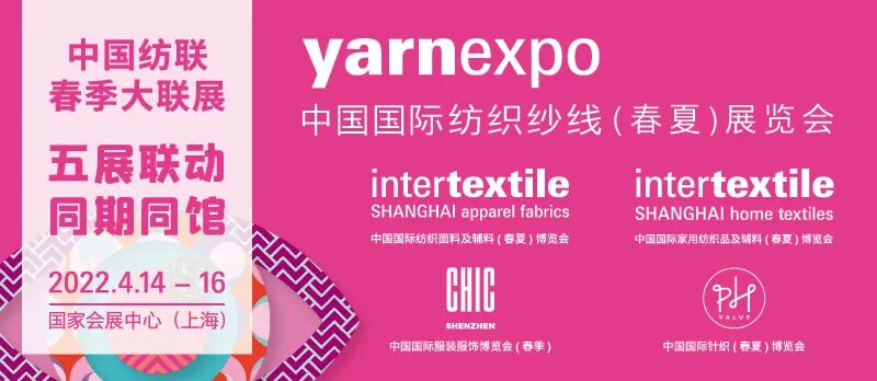 2022年4月14-16日,步入第19个年头的2022yarnexpo春夏纱线展将在国家会展中心(上海)继续与intertextile面辅料展、intertextile家纺展、CHIC服装展、PHValue针织展同期同地举办。