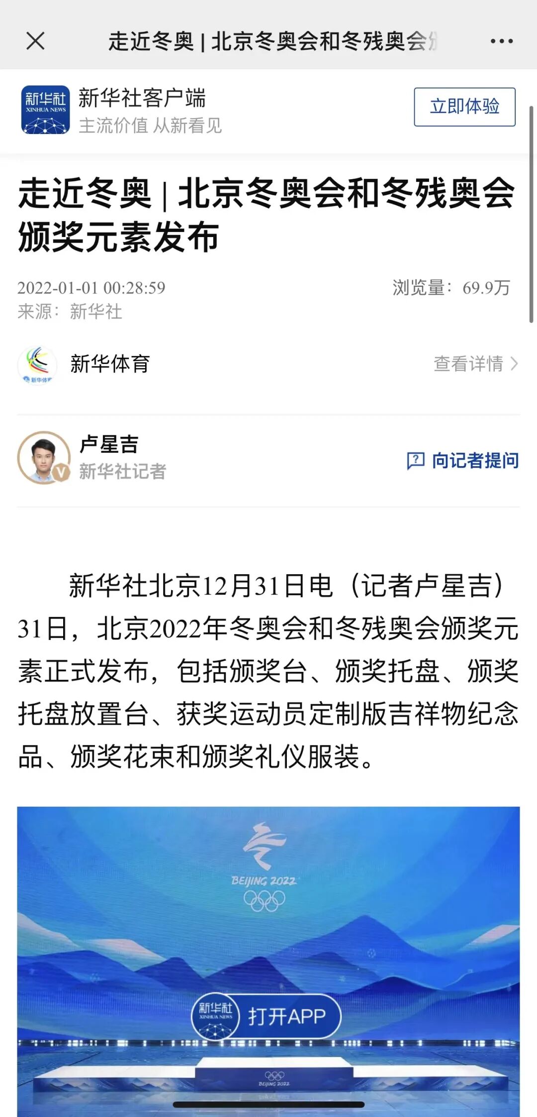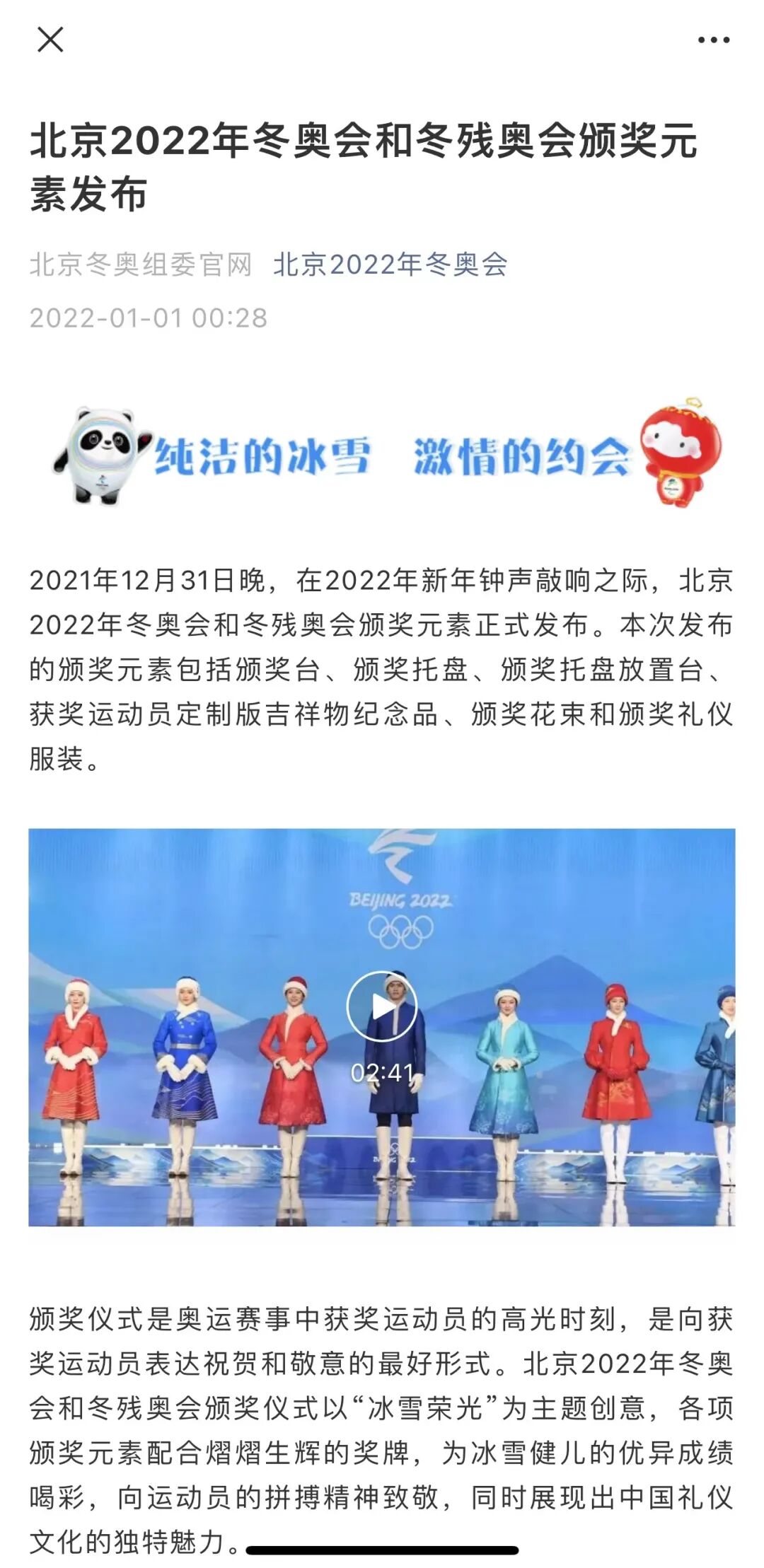 2021年12月31日晚,在2022年新年钟声敲响之际,北京2022年冬奥会和冬残奥会颁奖元素正式发布。