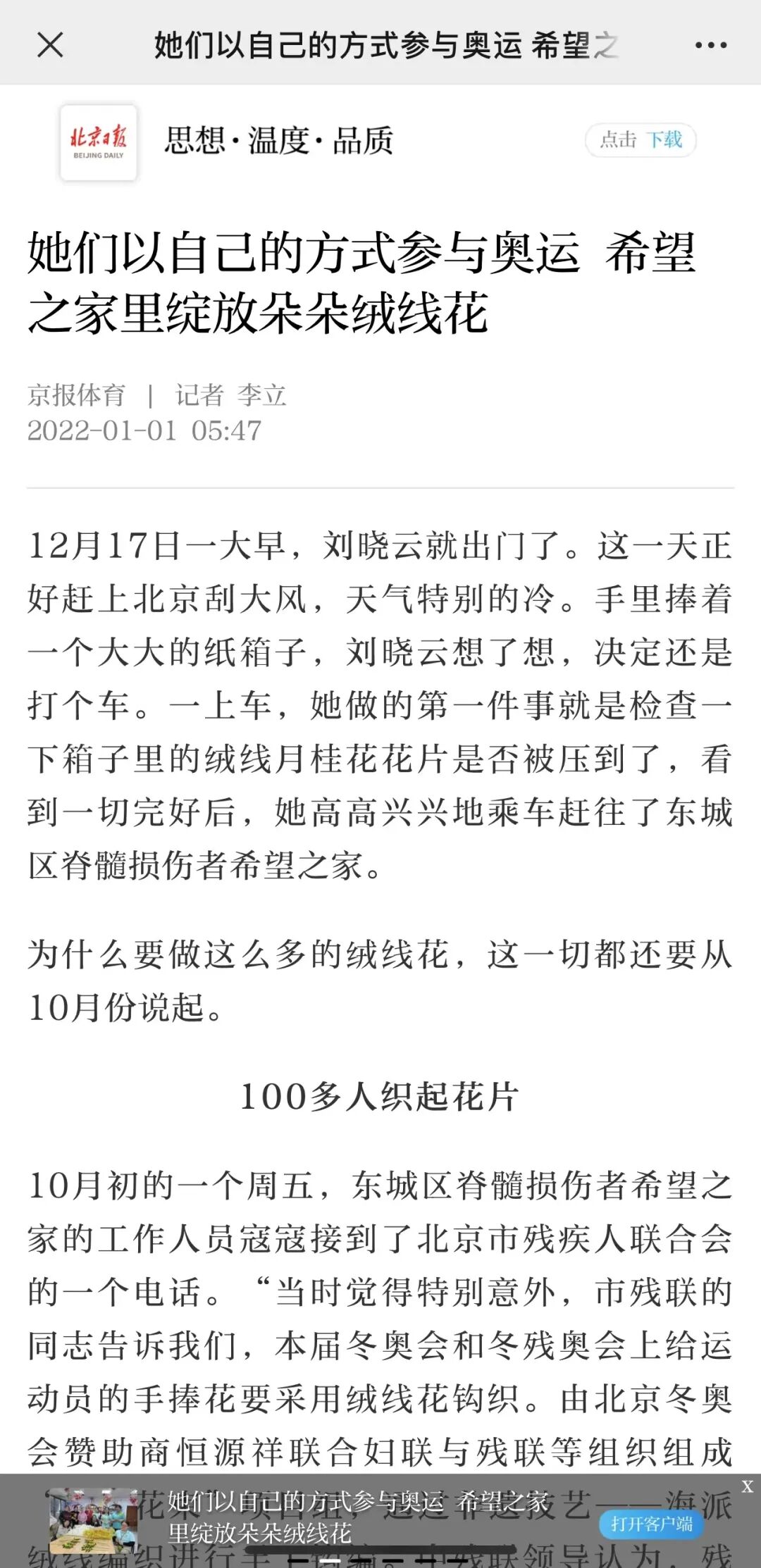 为了完成这项光荣又艰巨的任务,也为了创造条件让更多人参与北京冬奥会,恒源祥集团在全国妇联等组织的支持下,发动北京、上海、天津、江苏、浙江等省市七地的编结社团共同参与,其中北京冬残奥会的花束主要由中国残疾人福利基金会负责完成。