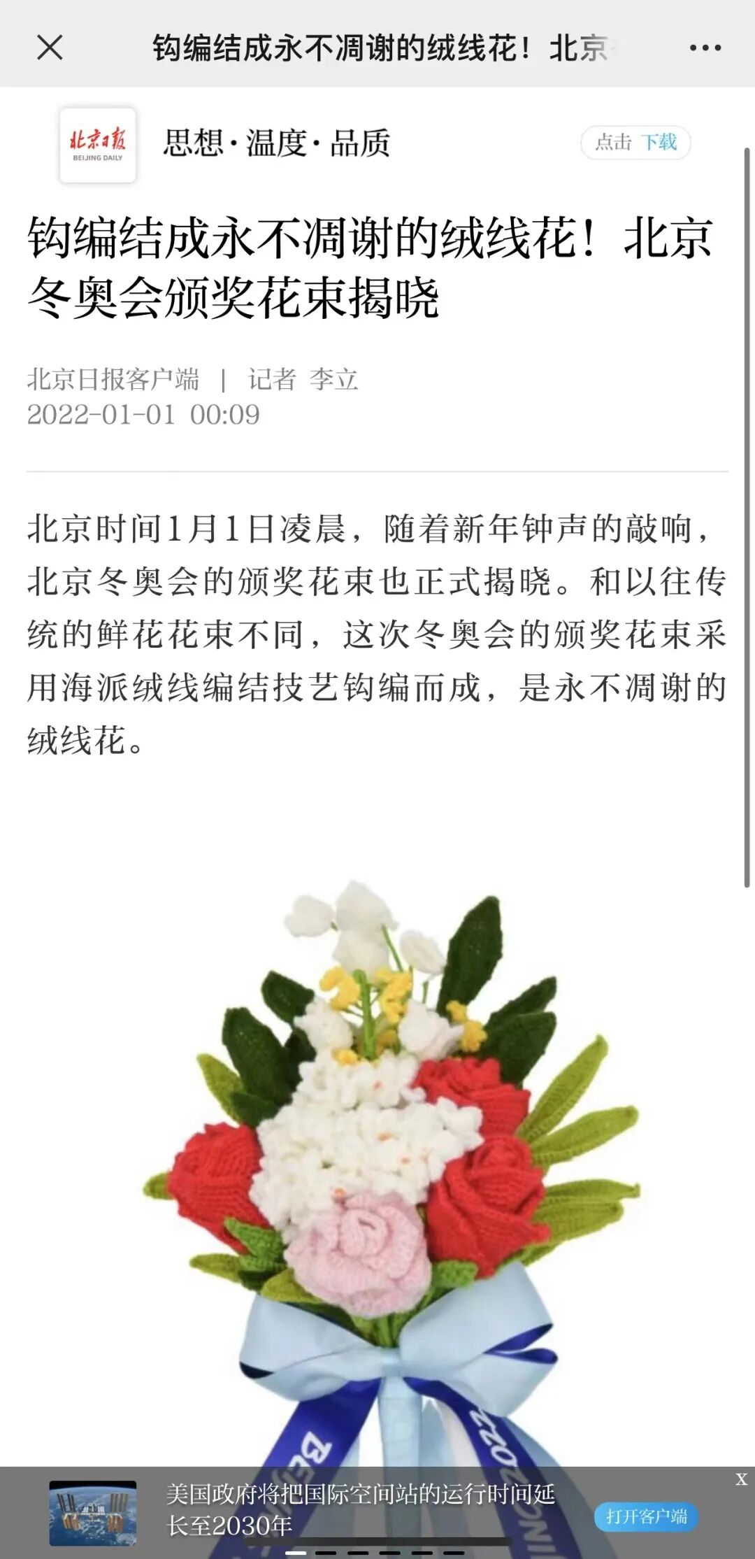 北京冬奥组委表示:“北京冬奥会是全球的体育盛事,我们采用融合中西技法的海派绒线编结技艺呈现颁奖花束,代表着我们对来自五大洲的运动员的热烈欢迎和祝贺,也代表着我们对人类美好未来的期盼与祝愿。此外绒线花束一方面不像鲜切花束需要从南方种植基地调运鲜花,大大降低了运输和管理的费用,另一方面也方便运动员携带回国、长久保存,既减碳降碳、节俭办奥又充满人性化安排。”