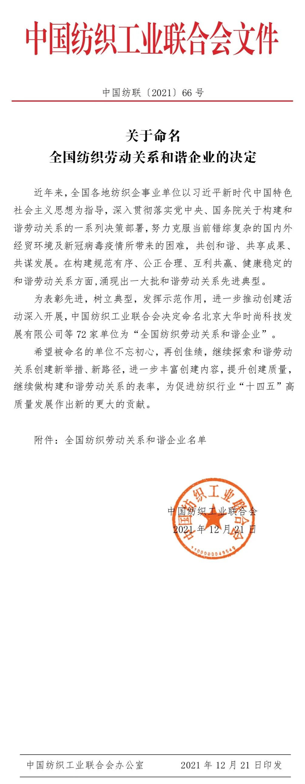 近年来,全国各地纺织企事业单位以习近平新时代中国特色社会主义思想为指导,深入贯彻落实党中央、国务院关于构建和谐劳动关系的一系列决策部署,努力克服当前错综复杂的国内外经贸环境及新冠病毒疫情所带来的困难,共创和谐、共享成果、共谋发展。在构建规范有序、公正合理、互利共赢、健康稳定的和谐劳动关系方面,涌现出一大批和谐劳动关系先进典型。