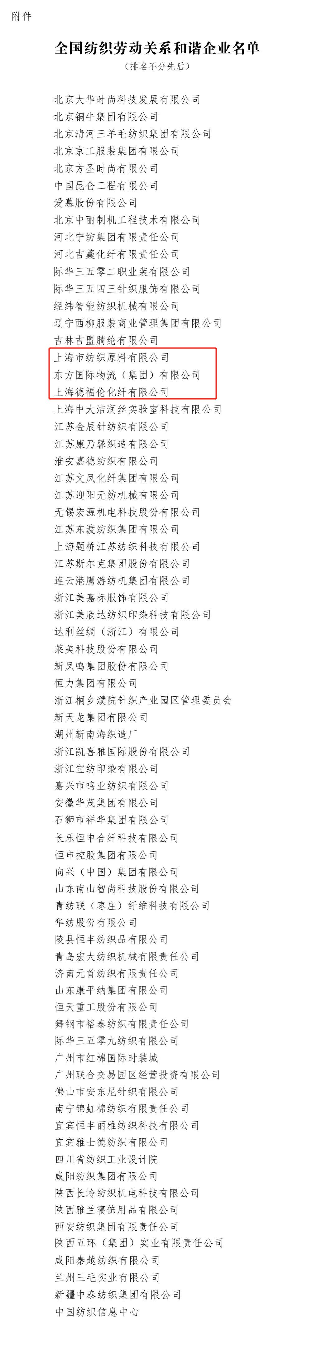 祝贺协会会长单位东方国际集团下属上海市纺织原料有限公司、东方国际物流(集团)有限公司、上海德福伦化纤有限公司上榜