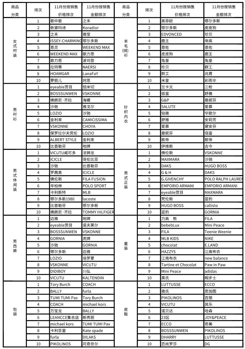 2021年11月份上海服装行业协会网络信息服装商品销售品牌排行榜
