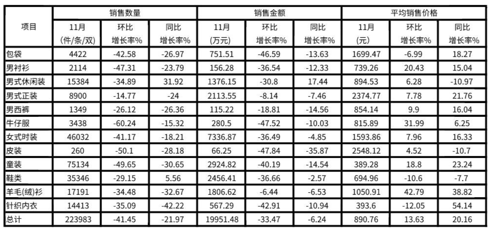2021年11月份上海服装行业协会网络信息服装商品分类销售情况表