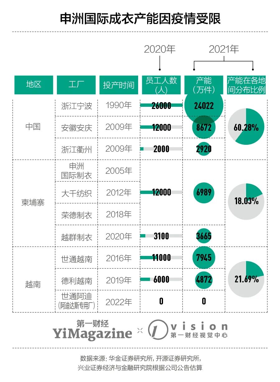 但这只能略微弥补一些损失——今年3月,申洲国际的柬埔寨生产基地停工了两周;7月,公司位于越南西宁省的制衣厂又停摆了,两个面料厂的实际产量缩水至正常产能的30%和33%。按照申洲国际测算,其越南生产基地开工受限每满两周,公司的布料和服装的年度总产能就将分别下降约2%和1%。