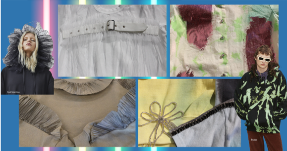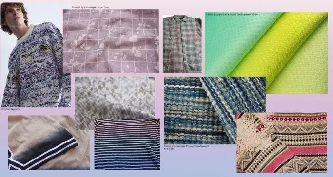面料:索环系带、褶边装饰、泼溅涂料印花、扎染、莱茵石饰物等,强调了Z世代自我的个性的表达。脉冲式条纹、扭曲条纹、80年代风格的多彩条纹,灵感来自电子脉冲。色织中的撞色/交叉染色,棉和醋酸纤维、涤纶纤维等化学纤维混纺产生金属光泽,抽象数码印花、皲裂纹理、木纹或兽皮纹理、人字纹和方平组织结构等表现反主流文化的破碎破裂感。