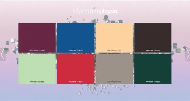 颜色:这组颜色来源于现实生活,带着梦幻的意境。合成的和有机的色调融合在一起。具有磁性的紫色、棕色和青色,与充满活力的蓝色、粉红色及桃红色、薄荷色和灰色,形成相互的制约与平衡。这样的颜色组合有助于设计水乳交融的图案,通过悬浮纹理的印花重新想象自然。