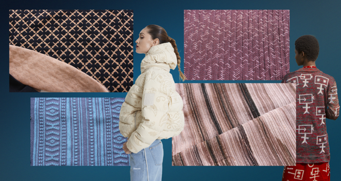 面料:这组面料展示了受象形文字等古代实践和符号启发的印花和组织结构,体现了拥抱古老技术和设计实践的理念。以自然或矿物的洗水和染色效果,替代扎染和漂白;或通过贴条、接缝、钩针编织等营造粗犷的手感、纹理和款式,反映重新野化和自然的趋势。而适用于秋冬季的厚重面料、绗缝,也为原始趋势带了奢华的美感。此外,不同的纹理和织物的贴块、撞色,也将表现出大自然地形的变化。