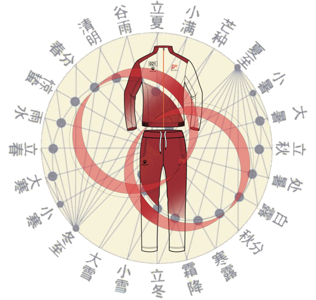 火炬手服装命名为“荣耀红”,设计灵感取自会徽礼天玉璧“圆”的形象。圆是中华民族传统文化的形态象征,象征着“圆满”和“饱满”。以圆勾勒流动之意象,圆中有方,方中有圆,天圆地方之意,蕴含古代劳动人民的智慧。底纹图案以圆点做动态渐变,动静合一,体现速度与能量。同时融入运动人物形象,呼应会徽,体现本届全运会的特色;款式设计整体融入不对称设计风格,表现灵动且不失平衡。在设计中灵活运用运动服装款式,满足运动属性与功能诉求,同时融入赛事仪式感,美观大方,象征了运动赛事体育精神;色彩来源于中国色系与会徽辅助色系,赋予服装以感情,体现火炬传递的荣耀使命。服装面料采用运动功能性面料,吸湿透气,符合人体运动需求。