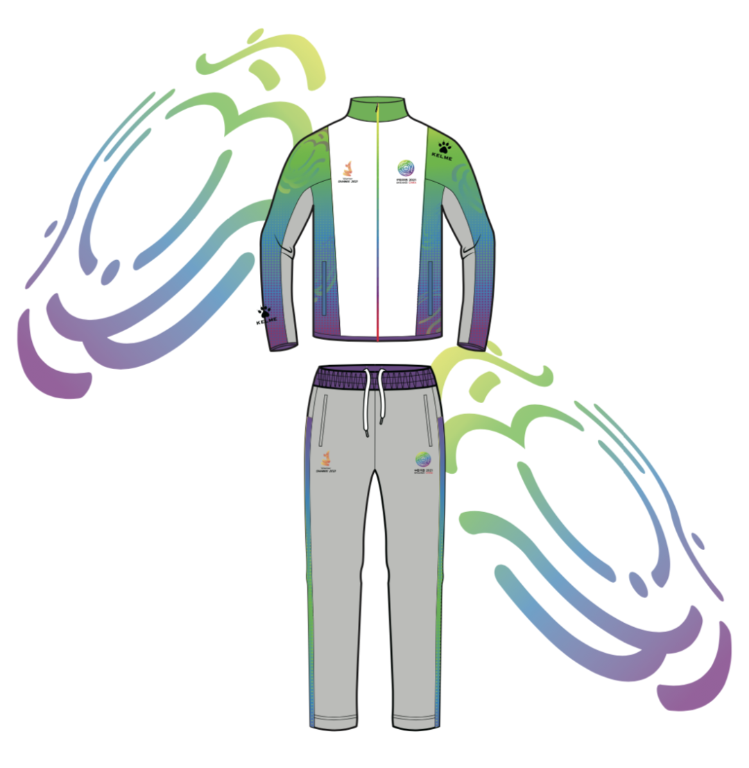 赛会志愿者服装命名为“活力彩”,整体设计风格偏向现代感。将会徽辅助图形进行3D透视处理,与具有节奏感的点状渐变结合,核心渐变色的拉链丰富细节设计,使服装整体在视觉上具有现代感,使志愿者穿着其与赛会景观相呼应。运动外套款式用了纵向分割的设计,体现干净利落的视觉效果。短袖领子采用了较为正式的翻领设计,插肩袖设计更能体现出运动风格。下裤松紧腰头设计增加舒适感,侧边风格设计上加入点状渐变设计与上衣互相呼应;色彩取自于会徽辅助色系,赋予服装以情感,体现赛事志愿者青春活力的精神面貌。