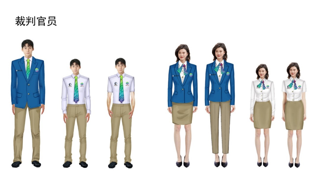 裁判官员服装命名为“全运彩”。西安是中国四大古都之一,中华文明和中华民族重要发祥地之一,有着浓厚的历史积淀。而“衡”作为为秦朝的度量工具,文字又可引申为平衡、评定之意;在色彩提取方面,同样融入了运动和文化内涵。其中运动蓝,给人一种青春、健康、向上的象征,沙土米、古都棕,彰显出古都的气质和丝绸之路上的景象;古都大雁塔是精神地标性建筑,底蕴雄厚。雁过留声也寓意着价值的表象体现。雁过无声代表了无私奉献的精神,默默付出才是最伟大的情怀,这与裁判官员的定位完全吻合。丝巾与领带的花纹颜色,与全运会会徽相呼应,以黄、绿、蓝、紫、红为主色调,其中黄色象征黄土高原,红色象征革命圣地,绿色象征生态文明,蓝色象征现代科技,紫色象征文化魅力,呈现中华民族伟大复兴的深厚历史渊源和广泛现实基础。