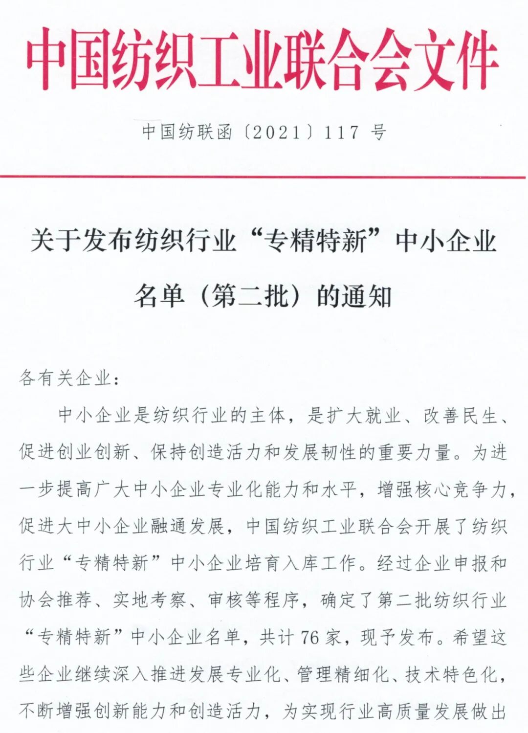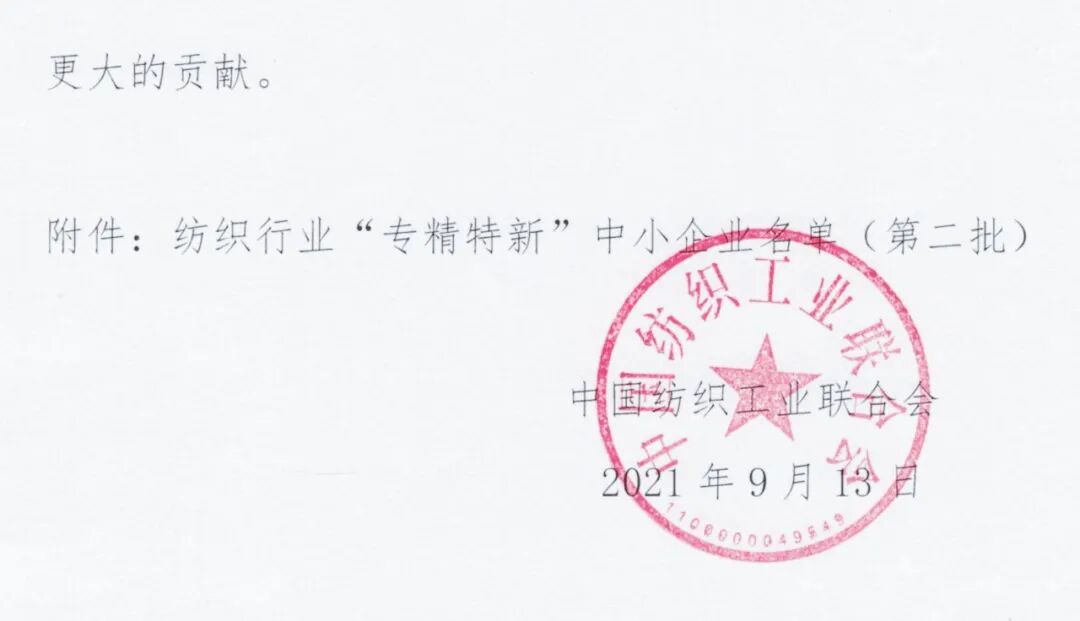 近年来,“专精特新”中小企业越来越受到关注,国家连续出台政策,扶持中小企业特别是“专精特新”企业发展,作为纺织行业的主体,中小企业是扩大就业、改善民生、促进创业创新、保持创造活力和发展韧性的重要力量。为进一步提高广大中小企业专业化能力和水平,增强核心竞争力,促进大中小企业融通发展,中国纺织工业联合会开展了纺织行业“专精特新”中小企业培育入库工作。经过企业申报和协会推荐、实地考察、审核等程序,最终确定了第二批纺织行业“专精特新”中小企业名单,共计76家。这些企业将继续深入推进发展专业化、管理精细化、技术特色化,不断增强创新能力和创造活力,为实现行业高质量发展做出更大的贡献。