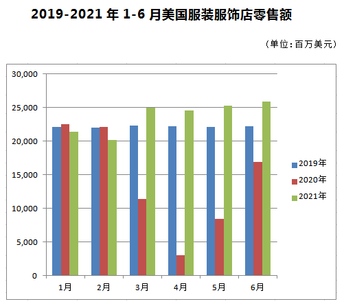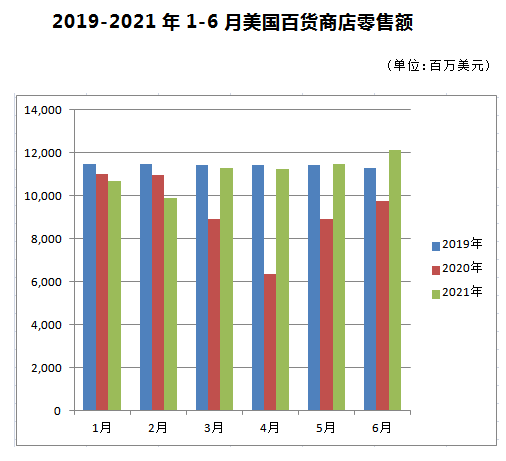 前六个月,百货商店累计销售额667亿美元,比2020年同期增长19%,较2019年同期也仅下降2.6%,自2月起百货商店零售额开始波动性恢复,5月起实现正增长,目前已恢复到疫情前水平。
