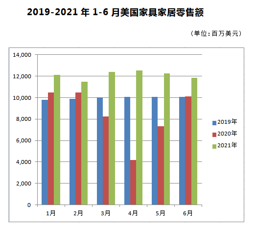 今年6月,家具家居零售额118亿美元,较5月份零售额122.7亿美元下降3.6%,在各类商品中降幅最大,零售额在4月达到峰值后,已连续两个月环比下降。从1-6月来看,家居家具零售总额726亿美元,较2020年同期仍增长43%,较2019年同期也增长21%,销售依旧火爆但趋于稳定。