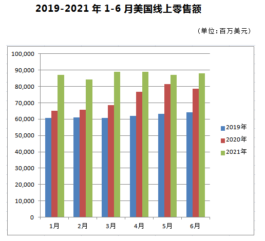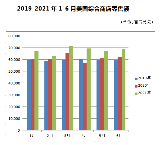 6月,综合商店(含百货商店和大型超市等)销售额685亿美元,与2020年同期相比增长11%,与2019年同期相比增长15%。1-6月,综合商店零售累计零售额达4063亿美元,比2020年同期增长11%,比2019年同期增长14%。