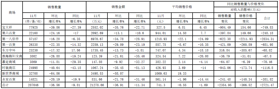 宝大祥公司,11月份实现服装销售7.79万件,环比减少39.86%,同比减少27.39%,本月实现服装销售收入2552.02万元,环比减少35.76%,同比减少了22.71%。本月平均销售价格为327.50元/件,环比上升6.81%,同比上升6.45%。其中,由于本月服装销售量同比发生变化,影响销售收入减少904.49万元,由于商品品牌结构调整,平均销售价格变化,直接影响销售收入增加154.66万元,二者共同影响销售收入减少749.83万元左右。