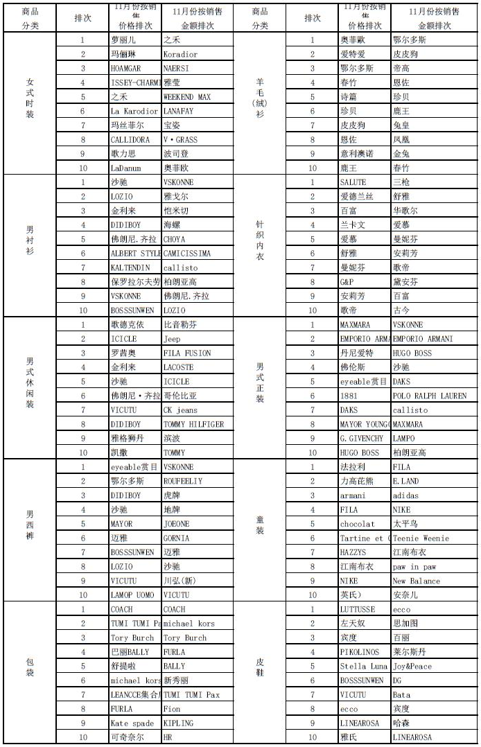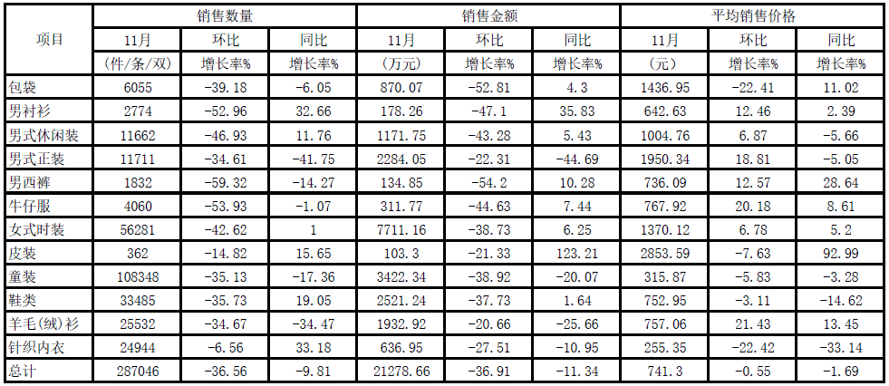 2020年11月份上海服装行业协会网络信息服装商品商场销售情况表