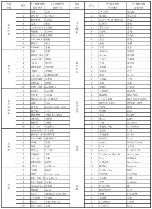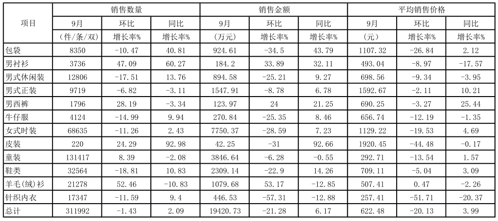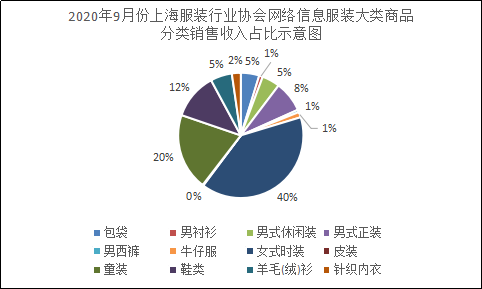 2020年9月份上海服装行业协会网络信息服装商品分类销售情况表