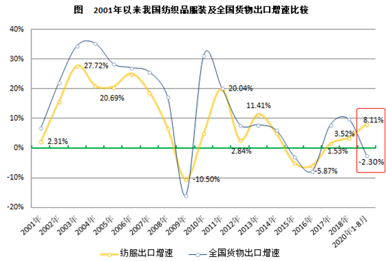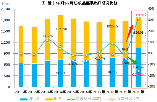 2020年1-8月,纺织服装累计出口1874.07亿美元,增长8.11%(全国货物贸易出口下降2.3%),其中纺织品出口1047.98亿美元,增长33.43%,出口额创历史同期最高水平;服装出口826.09亿美元,下降12.86%,出口额创近十年以来同期最低水平,纺织品与服装出口显著分化,纺织品成为拉动纺织品服装出口增速由负转正的关键动力。