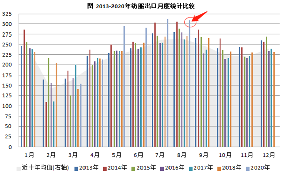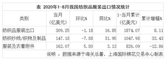 8月,纺织服装出口309.25亿美元,同比增长16.85%(全国货物贸易出口增长9.5%),其中纺织品出口147.18亿美元,增长31.95%,服装出口162.07亿美元,增长3.13%,为近6个月以来首次转正。