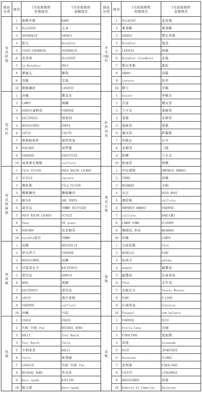 7月销售品牌排行榜