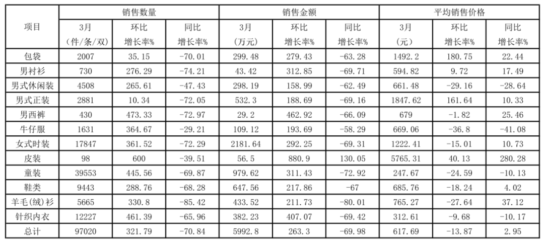 2020年3月份上海服装行业协会网络信息服装商品分类销售情况表