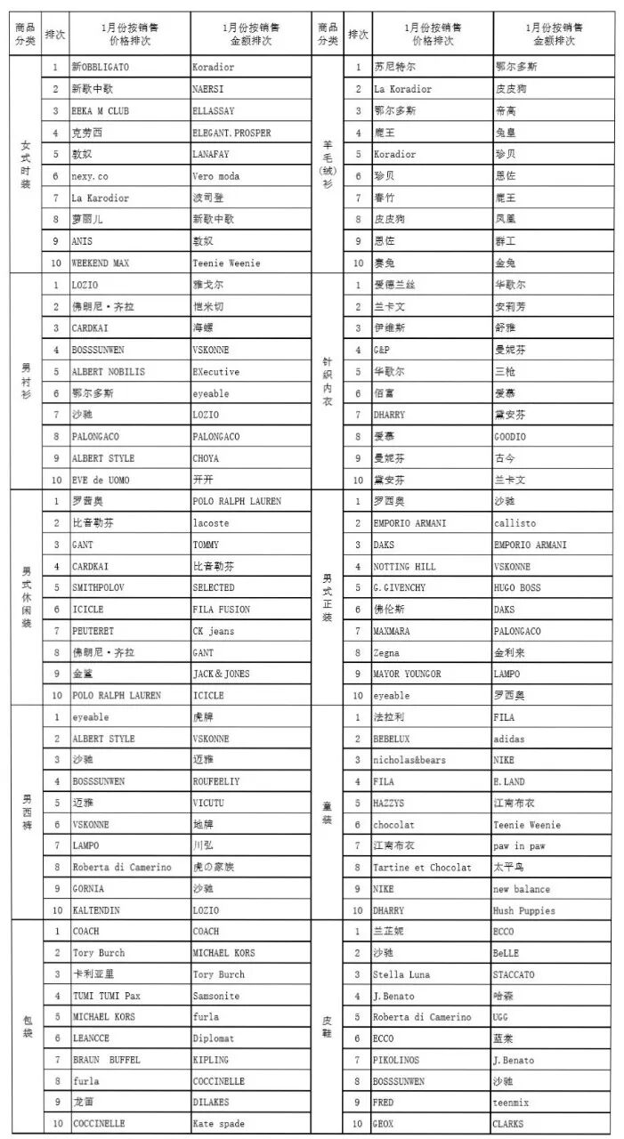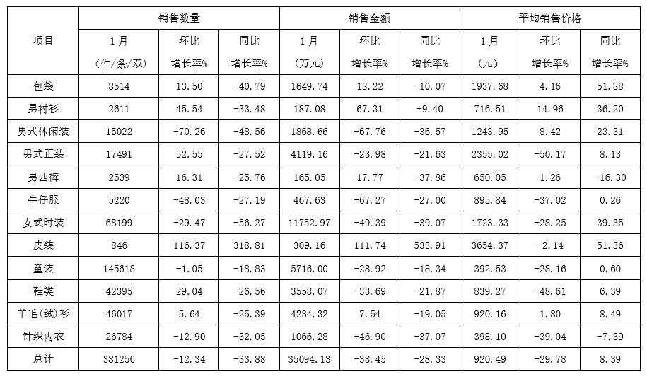 上海服装行业协会网络信息定期统计报表显示,2020年1月份,上海十大商场服装大类商品总体共销售38.13万件,环比上月减少5.37万件,环比减少12.34%,销售数量同比减少19.53万件,同比减少33.88%。2020年1月份,上海十大商场服装大类商品共计销售3.51亿元,环比上月减少2.19亿元左右,环比减少38.45%,销售金额同比减少1.39亿元,同比减少28.33%。本月平均销售价格为920.49元/件,环比下降29.78%,同比上升8.39%。从2020年1月份上海服装行业协会网络商场销售情况看,因新冠肺炎疫情影响及互联网线上销售的冲击,服装大类商品实体销售数量和金额环比同比均明显减少。