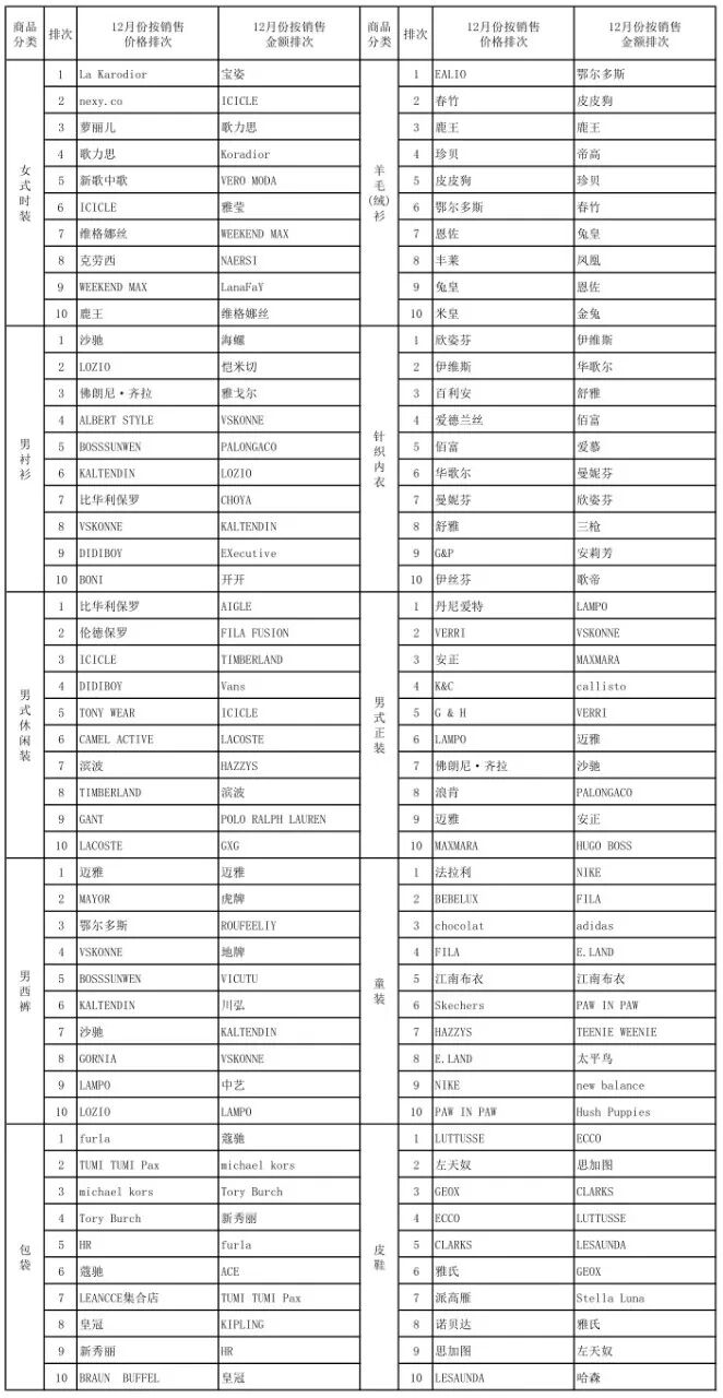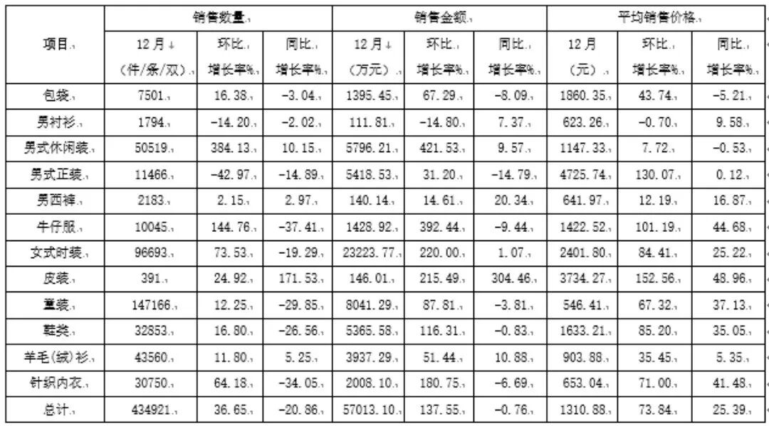 上海服装行业协会网络信息定期统计报表显示,2019年12月份,上海十大商场服装大类商品总体共销售43.49万件,环比上月增加11.66万件,环比增加36.65%,销售数量同比减少11.46万件,同比减少20.86%。2019年12月份,上海十大商场服装大类商品共计销售5.70亿元,环比上月增加3.30亿元左右,环比增加137.55%,销售金额同比减少0.04亿元,同比减少0.76%。本月平均销售价格为1310.88元/件,环比上升73.84%,同比上升25.39%。从2019年12月份上海服装行业协会网络商场销售情况看,服装大类商品实体销售数量和金额环比均显著增加,圣诞元旦节庆促销效应明显,但是受互联网线上销售的影响,销售数量和金额同比仍双双减少。