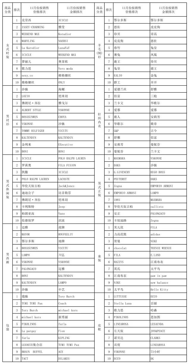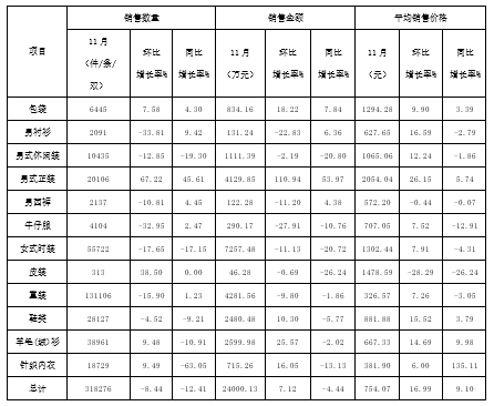 上海服装行业协会网络信息定期统计报表显示,2019年11月份,上海十大商场服装大类商品总体共销售31.83万件,环比上月减少2.93万件,环比减少8.44%,销售数量同比减少4.51万件,同比减少12.41%。2019年11月份,上海十大商场服装大类商品共计销售2.40亿元,环比上月增加0.16亿元左右,环比增加7.12%,销售金额同比减少0.11亿元,同比减少4.44%。本月平均销售价格为754.07元/件,环比上升16.99%,同比上升9.10%。从2019年11月份上海服装行业协会网络商场销售情况看,受季节影响,服装大类商品实体销售环比数量虽减少但金额反而增加,同时受互联网线上销售的影响,销售数量和金额同比双双减少。