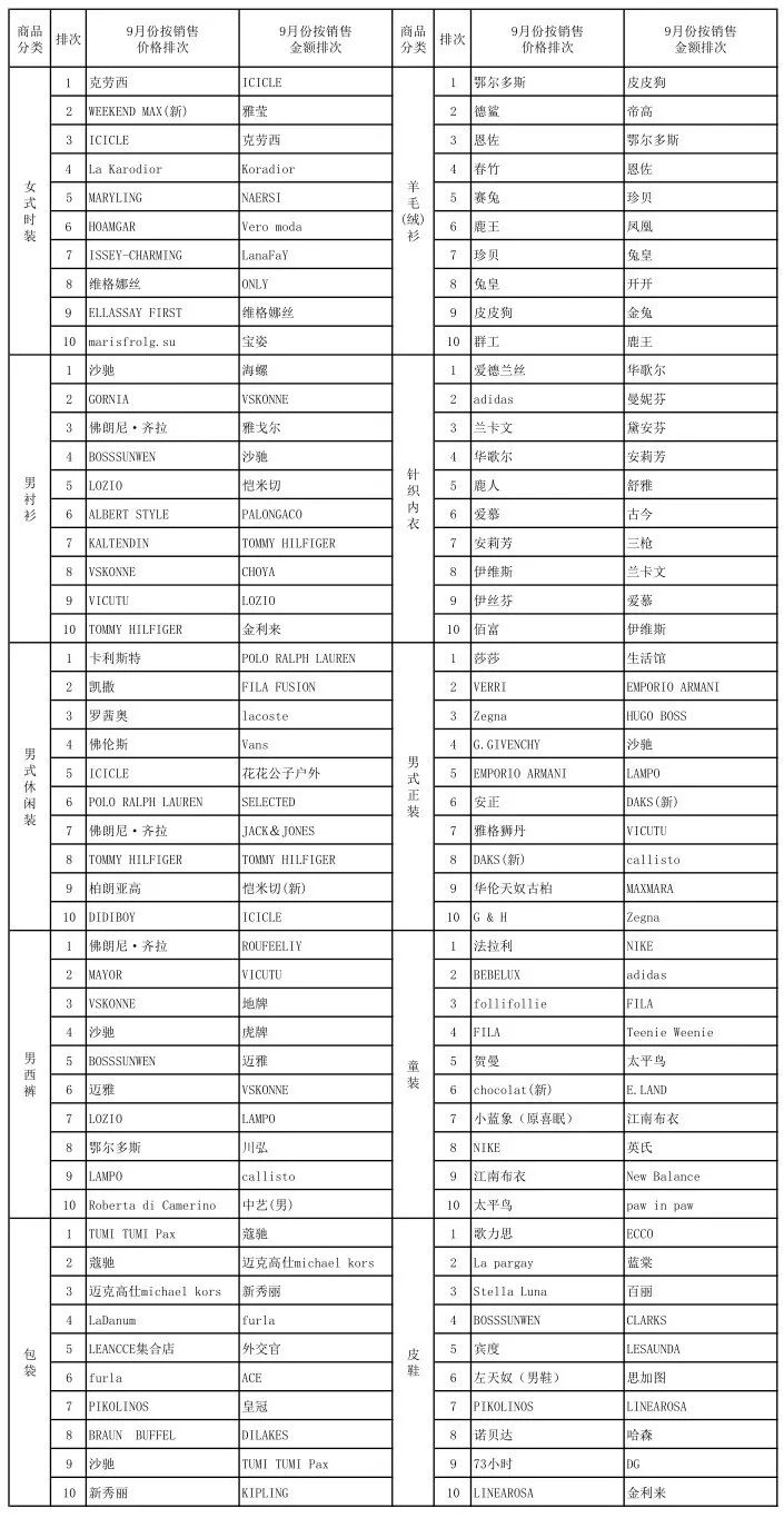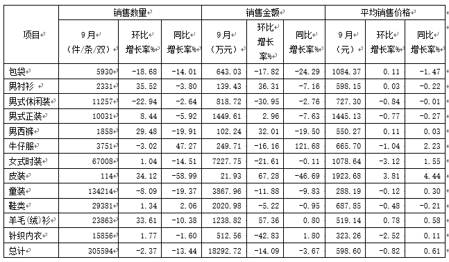 2019年9月份上海服装行业协会网路信息分类销售情况
